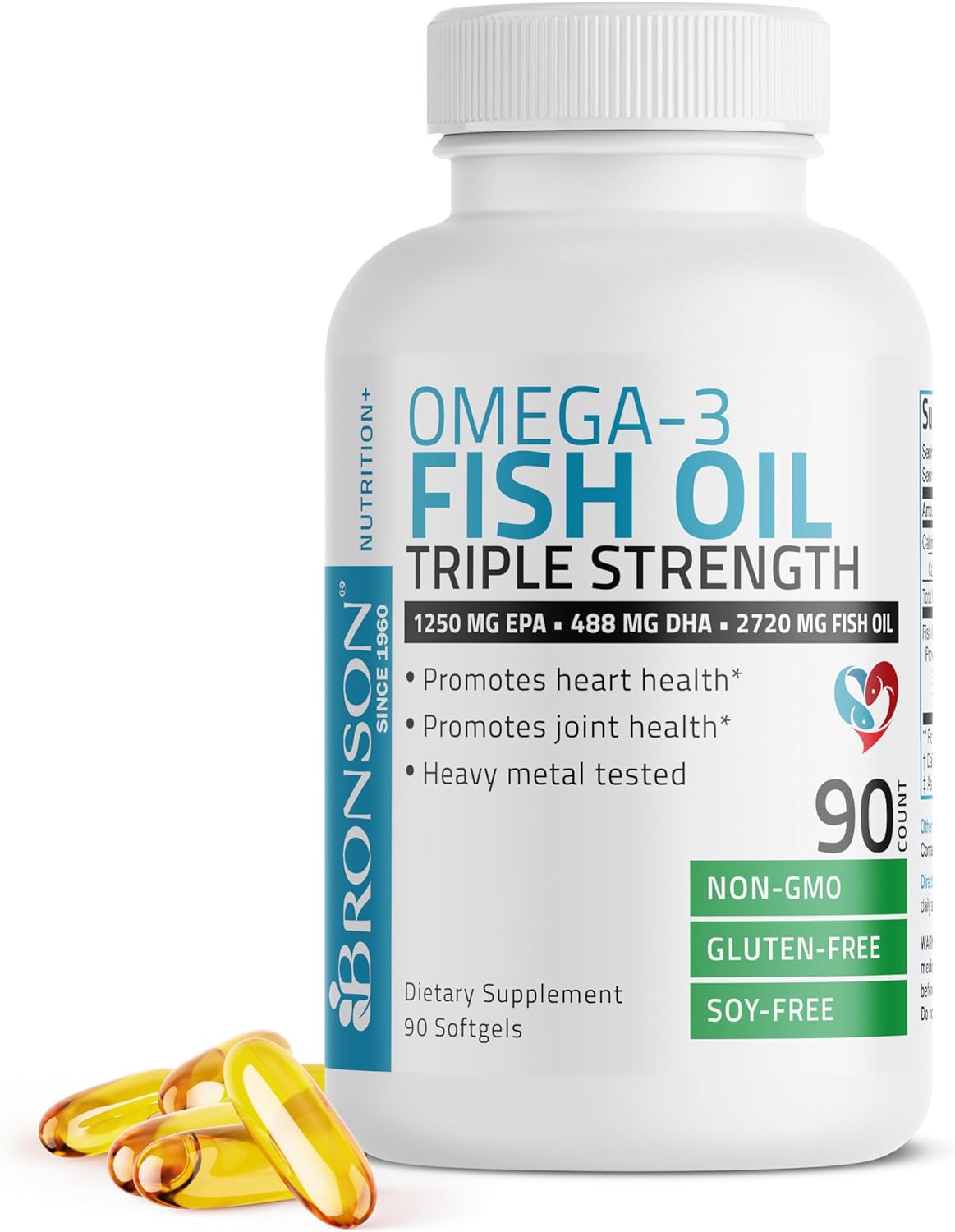 Bronson Omega 3 Fish Oil Triple Strength 2720 Mg, High Epa 1250 Mg Dha 488 Mg, Non-Gmo Heavy Metal Tested, 90 Softgels