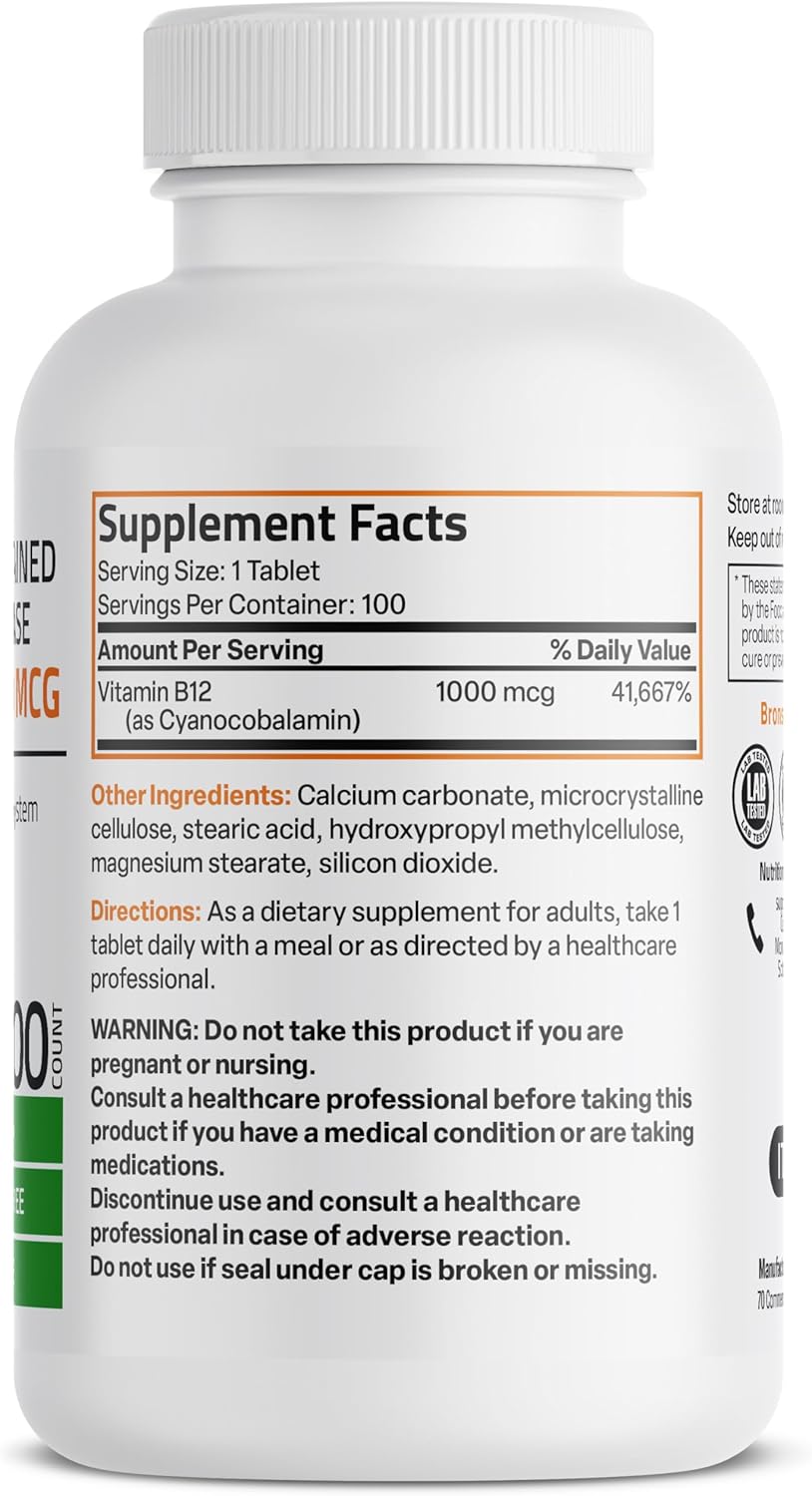 Bronson Vitamin B12 1000 Mcg (B12 Vitamin As Cyanocobalamin) Sustained Release Premium Non Gmo Tablets Supports Nervous System, Healthy Brain Function And Energy Production, 100 Count