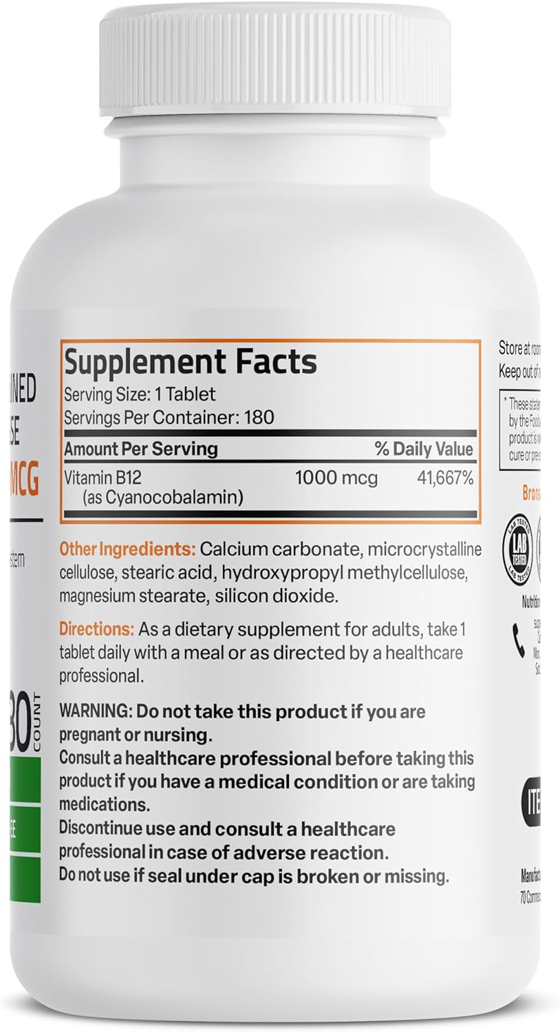 Bronson Vitamin B12 1000 Mcg (B12 Vitamin As Cyanocobalamin) Sustained Release Premium Non Gmo Tablets Supports Nervous System, Healthy Brain Function And Energy Production, 180 Tablets