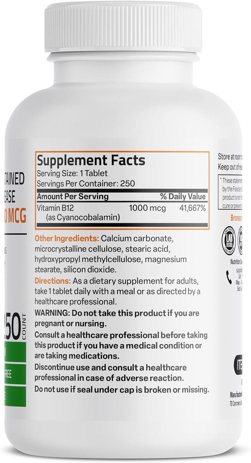 Bronson Vitamin B12 1000 Mcg (B12 Vitamin As Cyanocobalamin) Sustained Release Premium Non Gmo Tablets Supports Nervous System, Healthy Brain Function And Energy Production, 250 Count