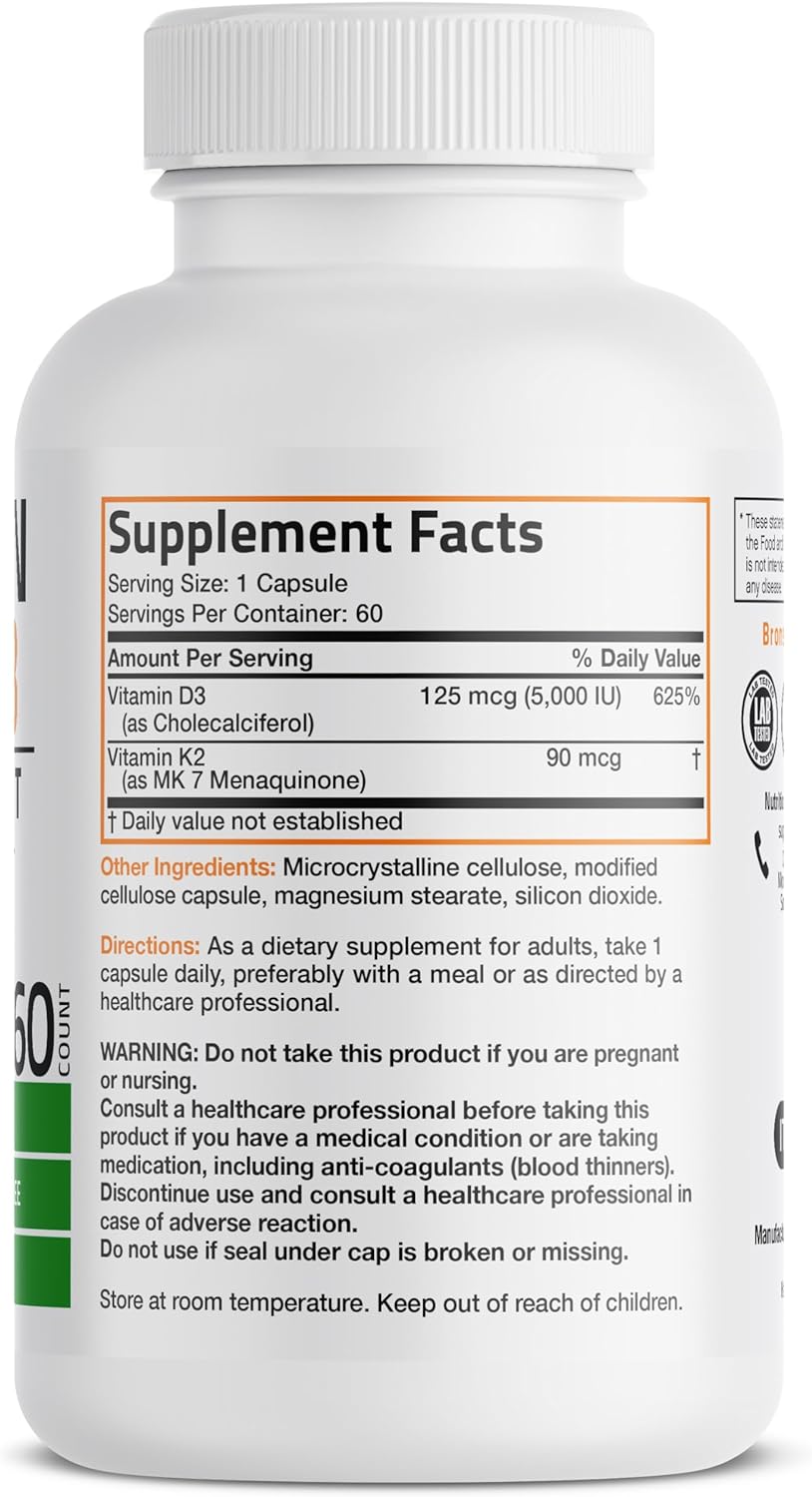 Bronson Vitamin K2 (Mk7) With D3 Supplement Non-Gmo Formula 5000 Iu Vitamin D3 & 90 Mcg Vitamin K2 Mk-7 Easy To Swallow Vitamin D & K Complex, 60 Capsules