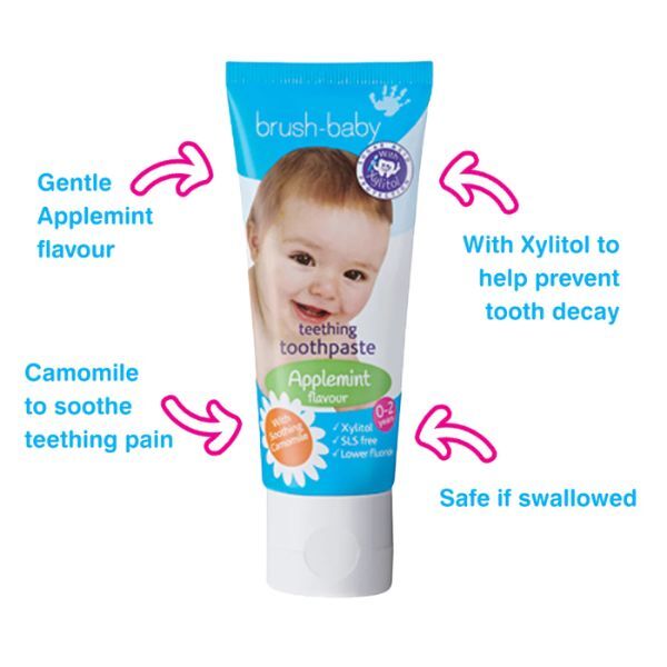 BABIES AND TODDLERS LOVE THE TASTE OF THIS TOOTHPASTE! An ideal first toothpaste or an alternative for little ones who are picky or don’t like minty flavours. Specially formulated for the teething stage, with a gentle applemint flavour that tiny tastebuds will love. The gentle fruity flavour and soothing formulation are the ideal way to encourage your little one if they are reluctant to brush! CREATE LOVELY SWEET-SMELLING KISSES! Suitable from birth, this toothpaste is rich in Xylitol - a natural ingredient which reduces sugar acids that can cause tooth decay, morning breath and dummy breath. The enamel of baby teeth tends to be thinner and needs extra protection. Brush-Baby Teething Toothpaste is lower in fluoride (500 ppmF) to help strengthen baby tooth enamel whilst being safer for your little one if swallowed. Use a smear on a Brush-Baby manual electric or Chewable toothbrush. NATURAL RELIEF FROM TEETHING. Brush-Baby Teething toothpaste is also SLS-free and non-foaming, Paraben-free, Dairy-free, Cruelty-free, Glitter-free, Microbead-free, and suitable for Vegans and Vegetarians. The tube has a safety seal and an easy to open and close flip-top cap. GIVE YOUR CHILDREN’S TEETH THE BEST START. Suitable from 0 - 24 months. Oral care starts on day one and you should clean your newborn baby's mouth, gums and tongue every day. Keeping teething gums clean can help to avoid gum inflammation and pain during teething. When baby teeth start to come through, it’s important to brush from the first tooth. Cleaning your little one’s teeth twice a day with a toothbrush and a small amount of age-appropriate toothpaste helps remove bacteria, keep their mouth clean. KEEPING YOUR LITTLE ONE'S SMILES HAPPY AND HEALTHY. Brush-Baby was inspired by a little girl who chewed her toothbrush! We know what it takes to give your babies, toddlers, young children and older kids the best start with their oral health and encourage them to develop healthy brushing habits