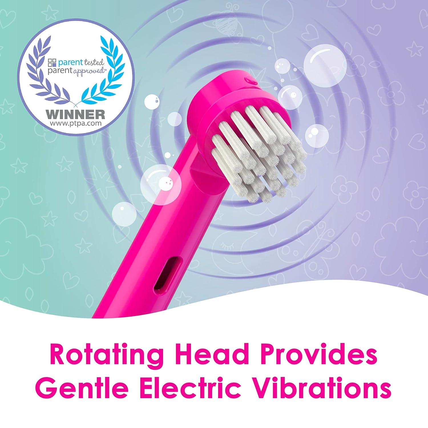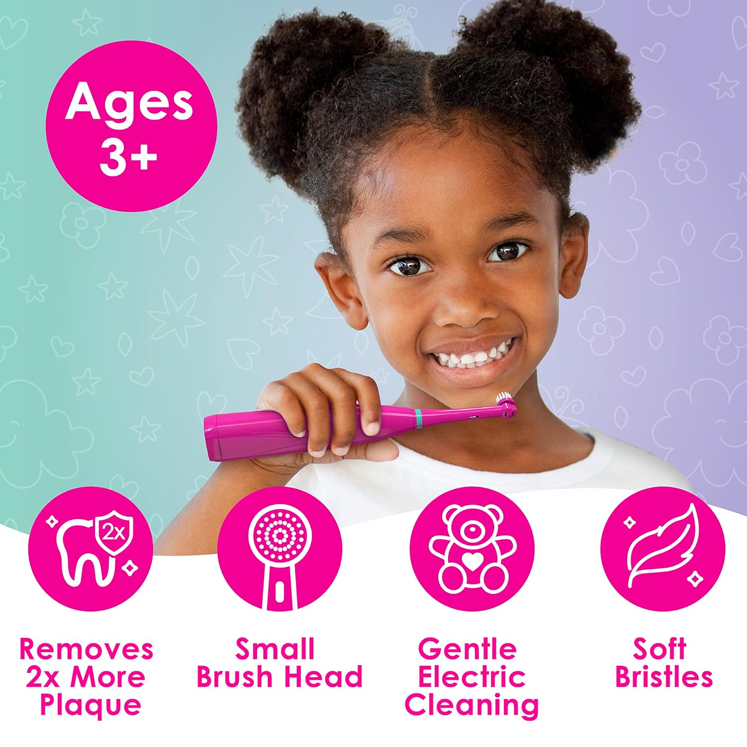 YOUR KIDS NEW FAVORITE TOOTHBRUSH: Make brushing fun with this cute and colorful, animal-themed electric toothbrush for kids that’s designed for brushers ages 3+ to promote healthy oral hygiene!EFFECTIVE AT REMOVING PLAQUE: Soft, high-quality bristles provide gentle vibration that removes 2x more plaque than a manual toothbrush. Plus, each Brusheez toothbrush comes with a replacement brush head to replace every 3 months, so you can keep their toothbrush dry and ensure that the bristles stay durable and effective!CERTIFIED KIDS SAFE: Our Brusheez kids electric toothbrush is a Parent Tested, Parent Approved award winner, completely BPA-free, and is certified safe for kids!TRACK YOUR CHILD’S PROGRESS: What child doesn’t love getting a gold star Using the free brushing checklist included with this set, your child can earn 2 stars per day by remembering to brush morning and nightWHAT YOU GET: Battery-powered children’s toothbrush, animal-themed brush cover, replacement brush head, rinse cup, 2-minute sand timer, stand, user manual, printed brushing chart, and industry-leading 5 Year WarrantyBrusheez® Kids’ Electric Toothbrush Set - Safe & Effective for Ages 3+ - Parent Tested & Approved with Gentle Bristles, 2 Brush Heads, Rinse Cup, 2-Minute Timer, & Storage Base (Prancy The Pony)