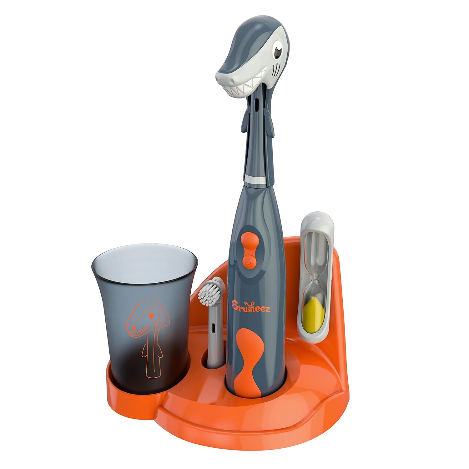 YOUR KIDS NEW FAVORITE TOOTHBRUSH: Make brushing fun with this cute and colorful, animal-themed electric toothbrush for kids that’s designed for brushers ages 3+ to promote healthy oral hygiene!EFFECTIVE AT REMOVING PLAQUE: Soft, high-quality bristles provide gentle vibration that removes 2x more plaque than a manual toothbrush. Plus, each Brusheez toothbrush comes with a replacement brush head to replace every 3 months, so you can keep their toothbrush dry and ensure that the bristles stay durable and effective!CERTIFIED KIDS SAFE: Our Brusheez kids electric toothbrush is a Parent Tested, Parent Approved award winner, completely BPA-free, and is certified safe for kids!TRACK YOUR CHILD’S PROGRESS: What child doesn’t love getting a gold star Using the free brushing checklist included with this set, your child can earn 2 stars per day by remembering to brush morning and nightWHAT YOU GET: Battery-powered children’s toothbrush, animal-themed brush cover, replacement brush head, rinse cup, 2-minute sand timer, stand, user manual, printed brushing chart, and industry-leading 5 Year WarrantyBrusheez® Kids’ Electric Toothbrush Set - Safe & Effective for Ages 3+ - Parent Tested & Approved with Gentle Bristles, 2 Brush Heads, Rinse Cup, 2-Minute Timer, & Storage Base (Shadow The Shark)