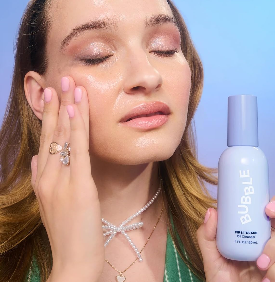 The Champagne of Cleansers - Bubble's First Class oil face cleanser quickly and easily breaks down oil-based products, like your makeup, SPF and any excess oil buildup. This lightweight oil formula soothes skin and transforms into a milky texture when rinsed away with water. Use First Class on its own or as the first step in a luxe and lush double cleanse routine. Skin-Nourishing Ingredients - Sunflower seed oil doubles as a gentle face cleansing oil that dissolves makeup and leaves your skin softer than ever. Prickly pear oil, which is also high in vitamin E, soothes and calms skin. Real Skin Results - Tested on 104 people over 7 days, 99% agreed this gentle cleanser left their skin feeling soft and 92% agreed it effectively removed oil-based makeup products.* How to Use - Massage the deep cleansing oil into dry skin with dry hands for 30 seconds to break down makeup, SPF, and other hard-to-remove products. Rinse well. Oil will transform into a milky texture when combined with water. Pat dry. Put Your Best Face Forward - The truth is, skin is tricky. Everyone's skin is different, and no one's skin is perfect. These are skincare realities we can’t change, but what we can change is the skincare industry’s outdated technology, science, ingredients, production practices, daily routines, and prices. It’s our mission to give everyone access to affordable, high-quality, effective skincare, so everyone can face their days with confidence. › See more product details,The Champagne of Cleansers - Bubble's First Class oil face cleanser quickly and easily breaks down oil-based products, like your makeup, SPF and any excess oil buildup. This lightweight oil formula soothes skin and transforms into a milky texture when rinsed away with water. Use First Class on its own or as the first step in a luxe and lush double cleanse routine,Skin-Nourishing Ingredients - Sunflower seed oil doubles as a gentle face cleansing oil that dissolves makeup and leaves your skin softer than ever. Prickly pear oil, which is also high in vitamin E, soothes and calms skin,Real Skin Results - Tested on 104 people over 7 days, 99% agreed this gentle cleanser left their skin feeling soft and 92% agreed it effectively removed oil-based makeup products,How to Use - Massage the deep cleansing oil into dry skin with dry hands for 30 seconds to break down makeup, SPF, and other hard-to-remove products. Rinse well. Oil will transform into a milky texture when combined with water. Pat dry,Put Your Best Face Forward - The truth is, skin is tricky. Everyone's skin is different, and no one's skin is perfect. These are skincare realities we can’t change, but what we can change is the skincare industry’s outdated technology, science, ingredients, production practices, daily routines, and prices. It’s our mission to give everyone access to affordable, high-quality, effective skincare, so everyone can face their days with confidence