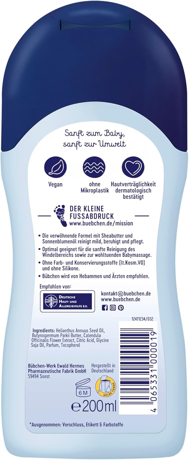 About this item The pampering formula with shea butter and sunflower oil cleanses, soothes and nourishes Ideal for gentle cleaning of the nappy area as well as for soothing baby massage Bübchen is recommended by midwives and doctors Skin compatibility dermatologically tested No microplastics No dyes › See more product details,The pampering formula with shea butter and sunflower oil cleanses, soothes and nourishes,Ideal for gentle cleaning of the nappy area as well as for soothing baby massage,Bübchen is recommended by midwives and doctors,Skin compatibility dermatologically tested,No microplastics,No dyes