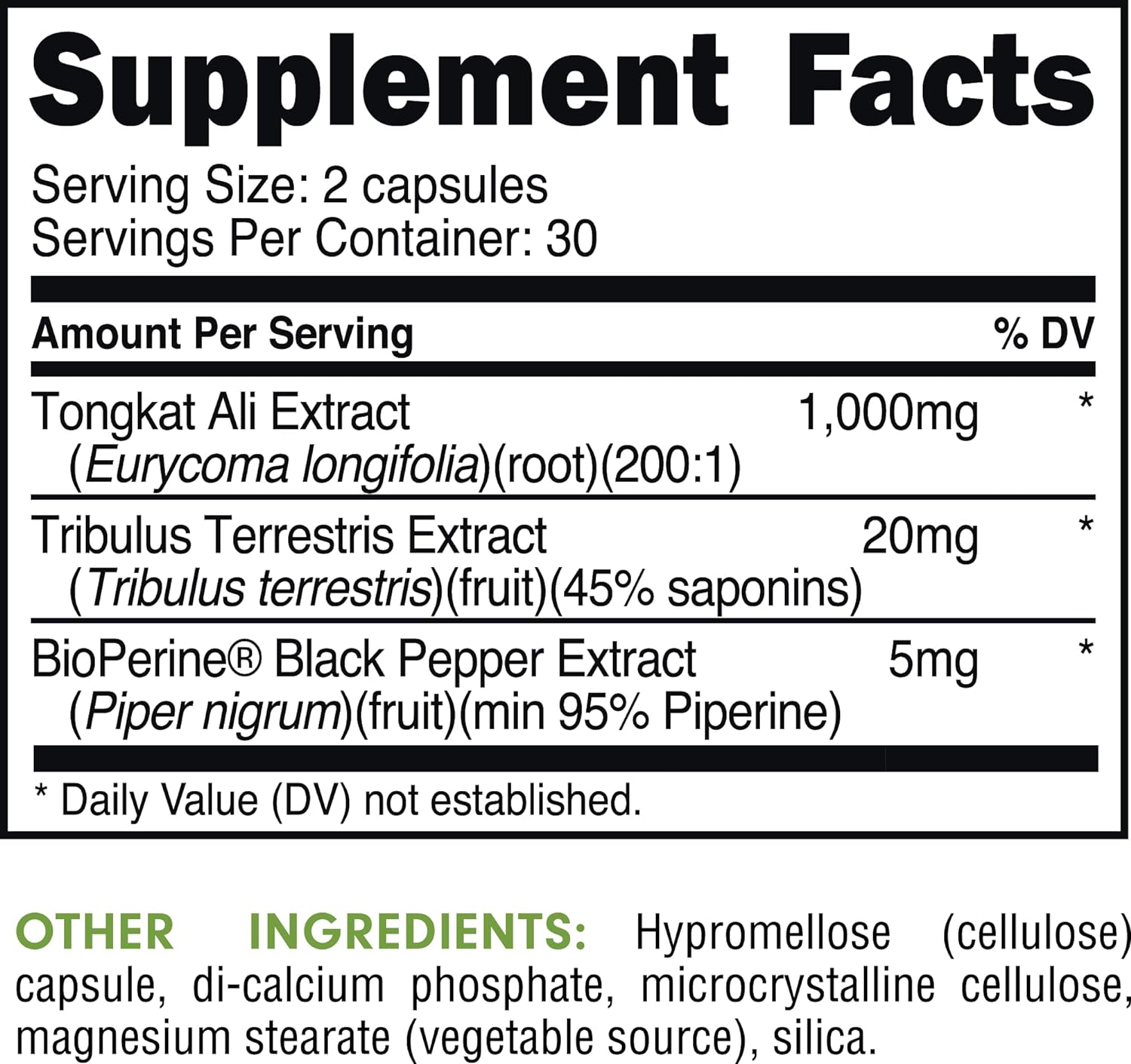 Content & Composition: Each bottle contains 60 capsules, with a serving size of 2 capsules providing 1000mg of Tongkat Ali, along with Tribulus Terrestris Extract and BioPerine Black Pepper Extract, totaling 30 servings