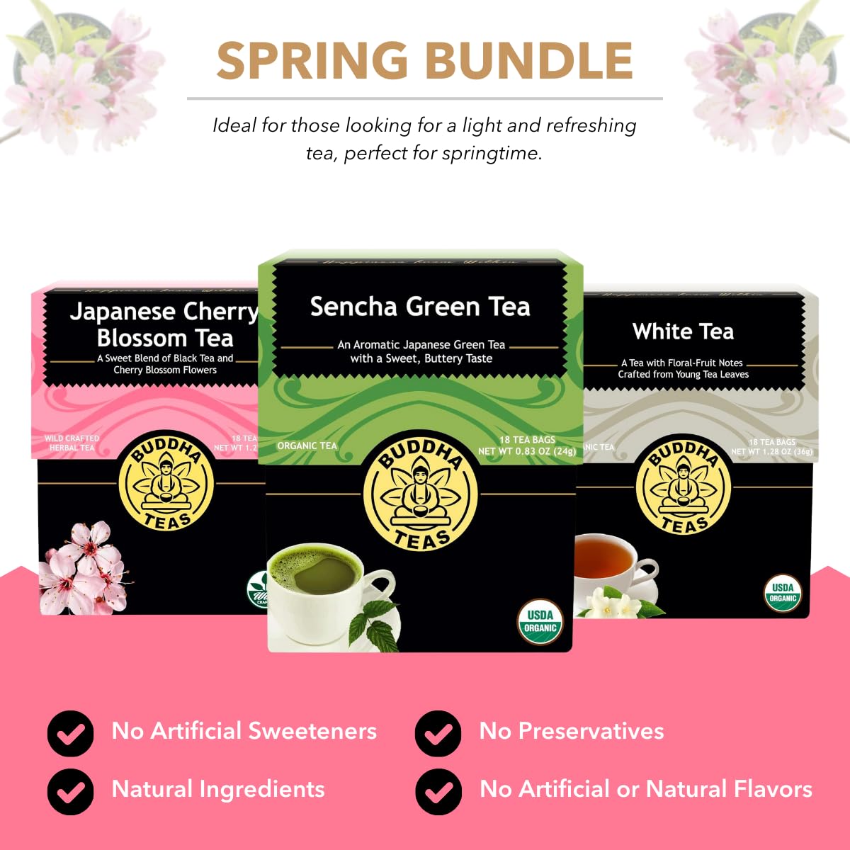 Buddha Teas - Organic Spring Tea Bundle - With Sencha Green Tea, White Tea & Japanese Cherry Blossom Tea - Antioxidants & Minerals - Light & Refreshing - Clean Ingredients - Ou Kosher & Non-Gmo - Pack Of 3