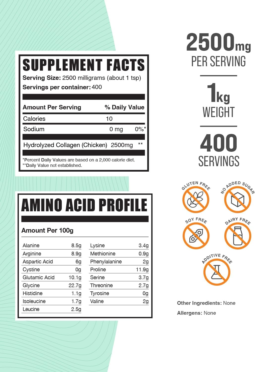 Bulksupplements.Com Chicken Collagen Powder - Hydrolyzed Collagen Powder, Collagen Supplement, Collagen Peptides Powder - Gluten Free, 2500Mg Per Serving, 1Kg (2.2 Lbs) (Pack Of 1)