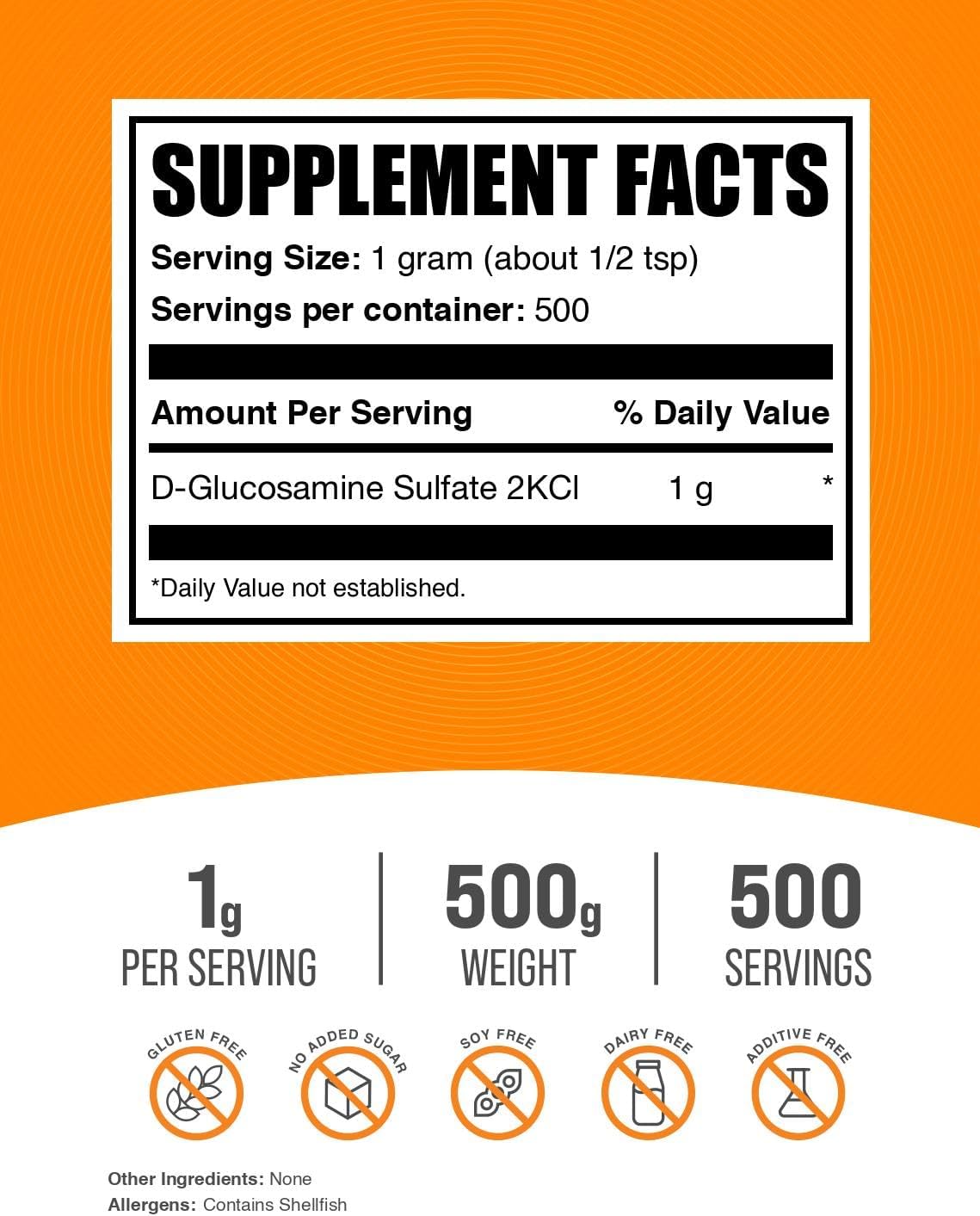 Bulksupplements.Com Glucosamine Sulfate Powder - Glucosamine Supplement, Glucosamine Powder - For Joint Support, Gluten Free, 1000Mg Per Serving, 500G (1.1 Lbs) (Pack Of 1)