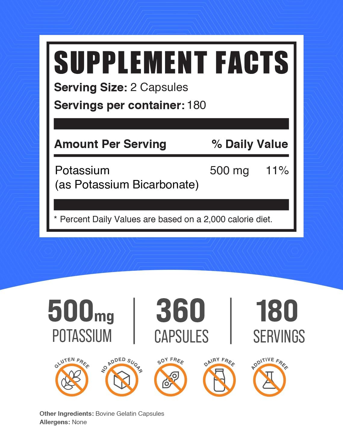 Bulksupplements.Com Potassium Bicarbonate Capsules - Potassium Bicarbonate Supplement, 500Mg Of Potassium - Essential & Gluten Free, 2 Capsules Per Serving, 360 Capsules (Pack Of 1)