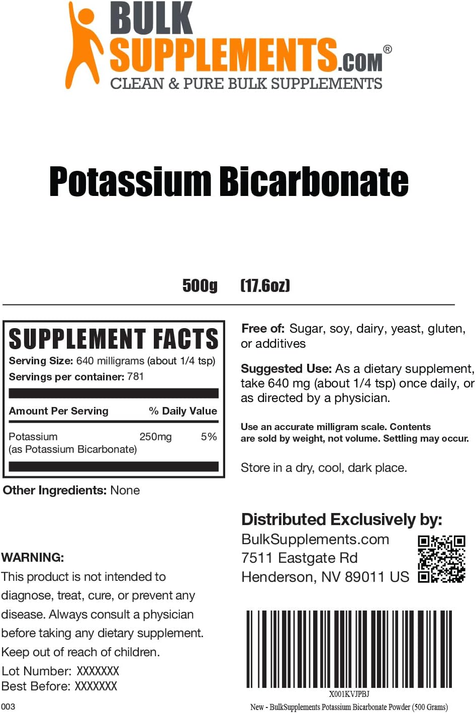 DESCRIPTION : BulkSupplements.com Potassium Bicarbonate Powder - Potassium Powder, Potassium Supplement Powder, Potassium Bicarbonate Food Grade - 640mg per Serving (250mg Potassium), 500g (1.1 lbs)1.1 Pound (Pack of 1)
