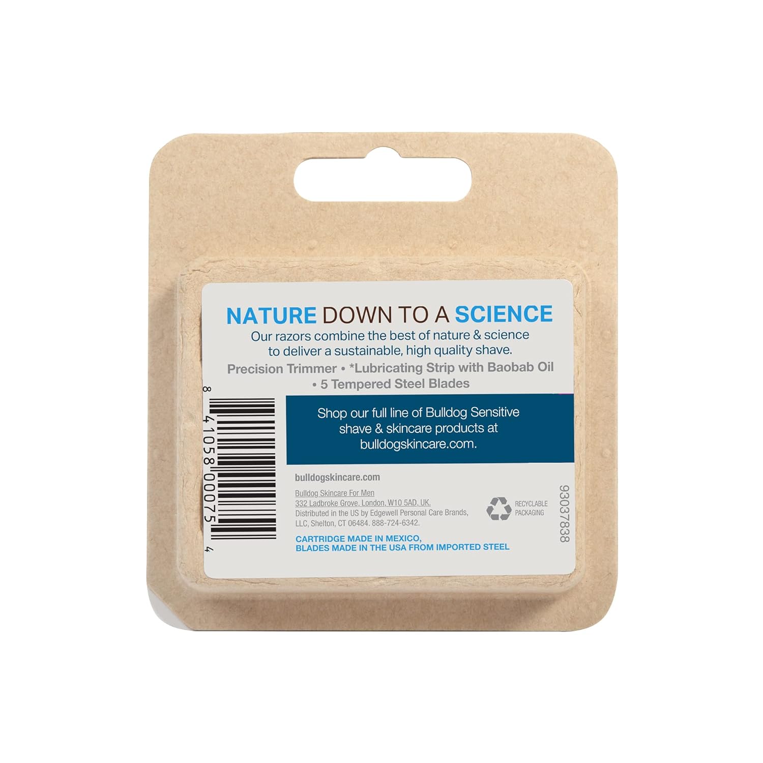 About this item Each mens razor refill features 5 tempered steel blades for a close, comfortable shave. Precision trimmer on the back of each cartridge for those tricky spots and perfecting your facial hair style. Lubricated guard strip enriched with baobab oil to protect and soothe the skin. Eco-conscious mens razor blade refill with a focus on reducing waste and promoting sustainability. The razor blade refills pack is designed with simplicity and ease of use, embodying Bulldog's straightforward skincare approach. › See more product details,Each mens razor refill features 5 tempered steel blades for a close, comfortable shave,Precision trimmer on the back of each cartridge for those tricky spots and perfecting your facial hair style,Lubricated guard strip enriched with baobab oil to protect and soothe the skin,Eco-conscious mens razor blade refill with a focus on reducing waste and promoting sustainability,The razor blade refills pack is designed with simplicity and ease of use, embodying Bulldog's straightforward skincare approach