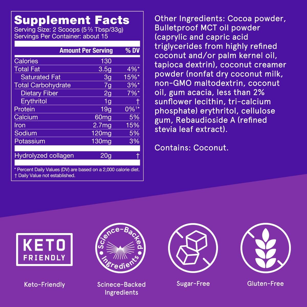 About this item Contains one 17.6-ounce jar Bulletproof Chocolate Collagen Peptides with MCT Oil Our keto-friendly Chocolate Collagen Peptides help maintain skin, bone and joint health. And we only use collagen types I and III, which are the most common, naturally occurring types in the body Every serving of Chocolate Collagen Peptides has 20g of collagen, less than 1g sugar and mixes easily into hot or cold water; add to coffee, smoothies, soups and more Chocolate Collagen Peptides provide three amino acids that you won't find in meaningful amounts in other commonly eaten proteins At Bulletproof, we only use science-backed ingredients to deliver maximum benefit. For a simple, consistent source of collagen, add Chocolate Collagen Peptides to your diet › See more product details,Contains one 17.6-ounce jar Bulletproof Chocolate Collagen Peptides with MCT Oil,Our keto-friendly Chocolate Collagen Peptides help maintain skin, bone and joint health. And we only use collagen types I and III, which are the most common, naturally occurring types in the body,Every serving of Chocolate Collagen Peptides has 20g of collagen, less than 1g sugar and mixes easily into hot or cold water; add to coffee, smoothies, soups and more,Chocolate Collagen Peptides provide three amino acids that you won't find in meaningful amounts in other commonly eaten proteins,At Bulletproof, we only use science-backed ingredients to deliver maximum benefit. For a simple, consistent source of collagen, add Chocolate Collagen Peptides to your diet
