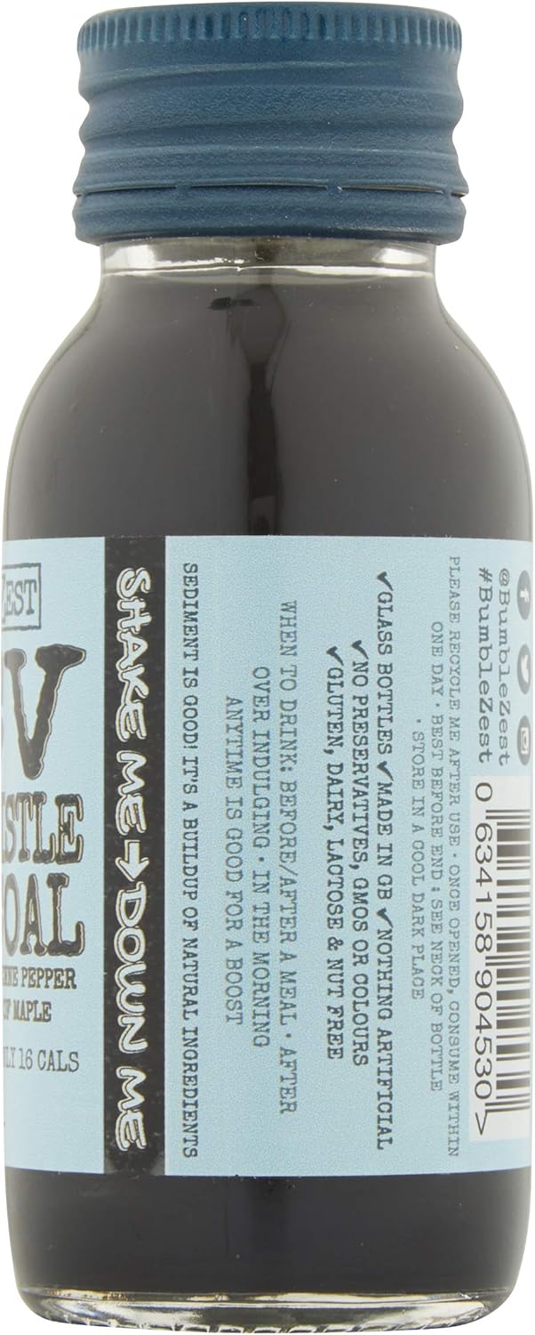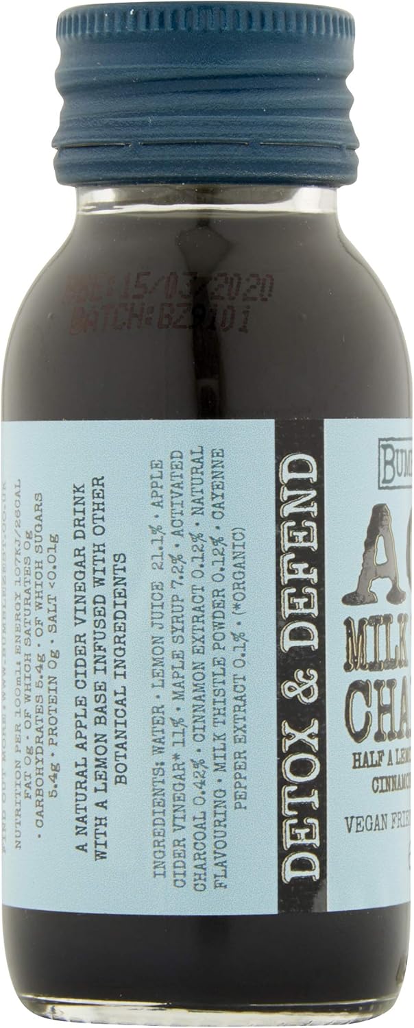 Product Description A natural apple cider vinegar, milk thistle and activated charcoal drink with a lemon base infused with other botanical ingredients. A warming citrusy cleanser and detoxer with a natural black activated agent, aid digestion and metabolism. Only 16 calories per shot. Comes with 20 bottles in a pack. Ingredients Water, Lemon Juice 21.1%, Apple Cider Vinegar* 11%, Maple Syrup 7.2%, Activated Charcoal 0.42% , Cinnamon Extract 0.12%, Natural Flavouring, Milk Thistle Powder 0.12%, Cayenne Pepper Extract 0.1%, (*Organic). P.when('A').execute(function(A) { A.on('a:expander:toggle_description:toggle:collapse', function(data) { window.scroll(0, data.expander.$expander[0].offsetTop-100); }); }); Directions Store in a cool dark place, best served chilled See more,Immunity boosting health shot,Packed with up to 9 functional, all-natural ingredients in each bottle,Only 16 calories per shot,Helps naturally aid detoxification,Removes toxins and stimulates metabolism,Vegan,100% recyclable little glass bottles and aluminium caps,Free from gluten, dairy, lactose and nuts