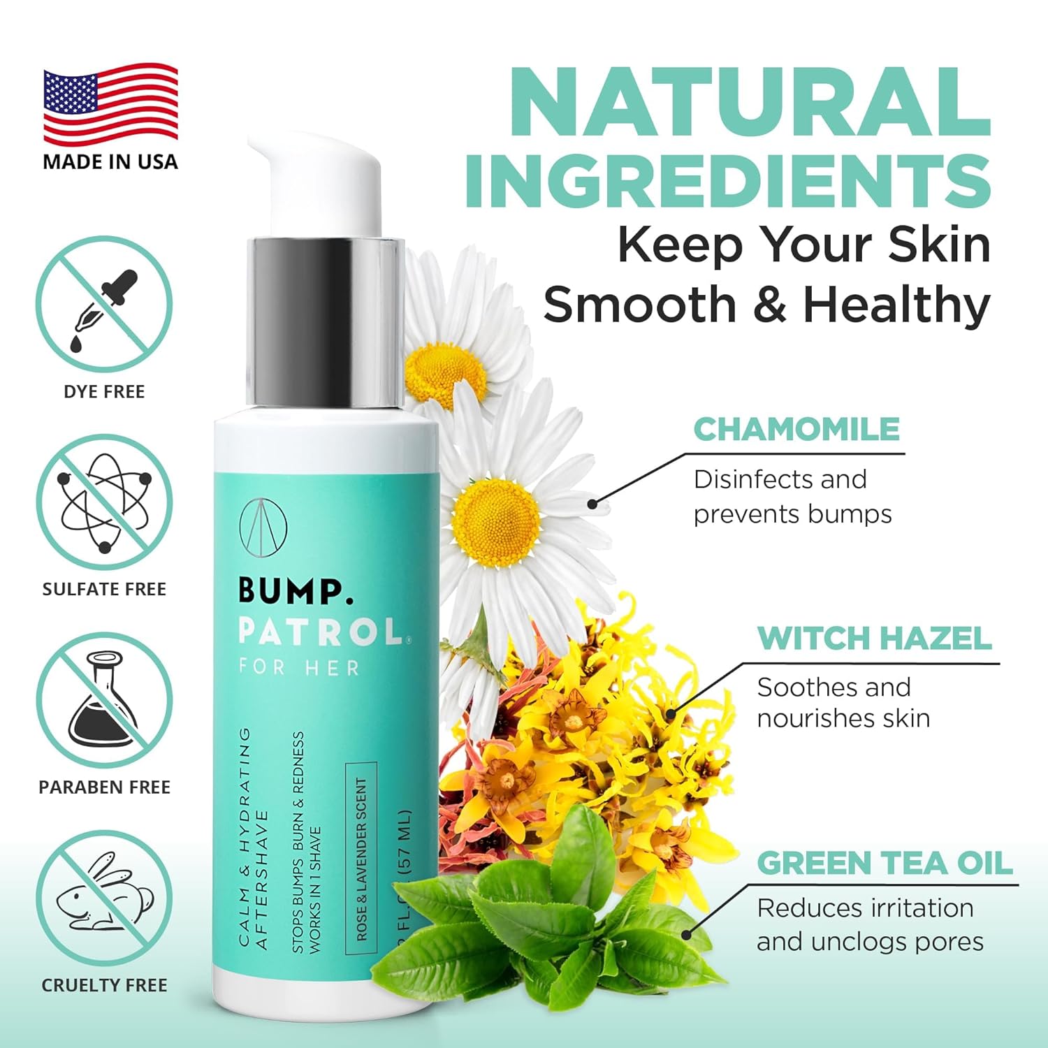About this item PREVENTS HAIR REMOVAL IRRITATION - Are you tired of dealing with razor bumps, razor burn, ingrown hairs, and irritation after shaving or waxing Bump Patrol For Her is the new gold standard in aftershave for women to prevent hair removal irritation before it begins, all while leaving behind a soothing rose and lavender scent. ELIMINATES SKIN IRRITATION - Bump Patrol For Her Calm & Hydrating Aftershave is proven to be effective at eliminating the lingering effects of hair removal! If you already have bumps, burns, or ingrown hairs - it will help to eliminate them and give you smooth and healthy skin. APPLY AFTER EVERY SHAVE - This ingrown hair serum and razor bumps treatment for women has been specifically designed to work on the most common areas that women shave - the bikini area, underarms, and legs. Shave, rinse the skin to remove excess shaving cream, pat skin dry, and apply to prevent and treat razor irritation. SOOTHES AND SMOOTHS SKIN - The active ingredients in our after shave for women work to soothe the skin and prevent inflammation and irritation, giving you smooth, healthy-looking skin that is free of razor bumps, razor burns, ingrown hairs, and irritation. This bikini bump blaster keeps your skin looking and feeling its best. DESIGNED FOR ALL HAIR REMOVAL METHODS - Aftershave is a versatile solution to the irritation experienced after waxing, shaving, and laser hair removal. It keeps skin protected and soothes it for an irritation-free experience. No Harsh Chemicals - Bump Patrol for Her Aftershave is specially formulated with ingredients that are designed to address the specific needs of women's skin, which can be different from men's skin. Our bikini bump treatment and razor burn treatment is also free of harsh chemicals like sulfates, parabens, and dyes, that can further irritate the skin. › See more product details,PREVENTS HAIR REMOVAL IRRITATION - Are you tired of dealing with razor bumps, razor burn, ingrown hairs, and irritation after shaving or waxing Bump Patrol For Her is the new gold standard in aftershave for women to prevent hair removal irritation before it begins, all while leaving behind a soothing rose and lavender scent,ELIMINATES SKIN IRRITATION - Bump Patrol For Her Calm & Hydrating Aftershave is proven to be effective at eliminating the lingering effects of hair removal! If you already have bumps, burns, or ingrown hairs - it will help to eliminate them and give you smooth and healthy skin,APPLY AFTER EVERY SHAVE - This ingrown hair serum and razor bumps treatment for women has been specifically designed to work on the most common areas that women shave - the bikini area, underarms, and legs. Shave, rinse the skin to remove excess shaving cream, pat skin dry, and apply to prevent and treat razor irritation,SOOTHES AND SMOOTHS SKIN - The active ingredients in our after shave for women work to soothe the skin and prevent inflammation and irritation, giving you smooth, healthy-looking skin that is free of razor bumps, razor burns, ingrown hairs, and irritation. This bikini bump blaster keeps your skin looking and feeling its best,DESIGNED FOR ALL HAIR REMOVAL METHODS - Aftershave is a versatile solution to the irritation experienced after waxing, shaving, and laser hair removal. It keeps skin protected and soothes it for an irritation-free experience,No Harsh Chemicals - Bump Patrol for Her Aftershave is specially formulated with ingredients that are designed to address the specific needs of women's skin, which can be different from men's skin. Our bikini bump treatment and razor burn treatment is also free of harsh chemicals like sulfates, parabens, and dyes, that can further irritate the skin