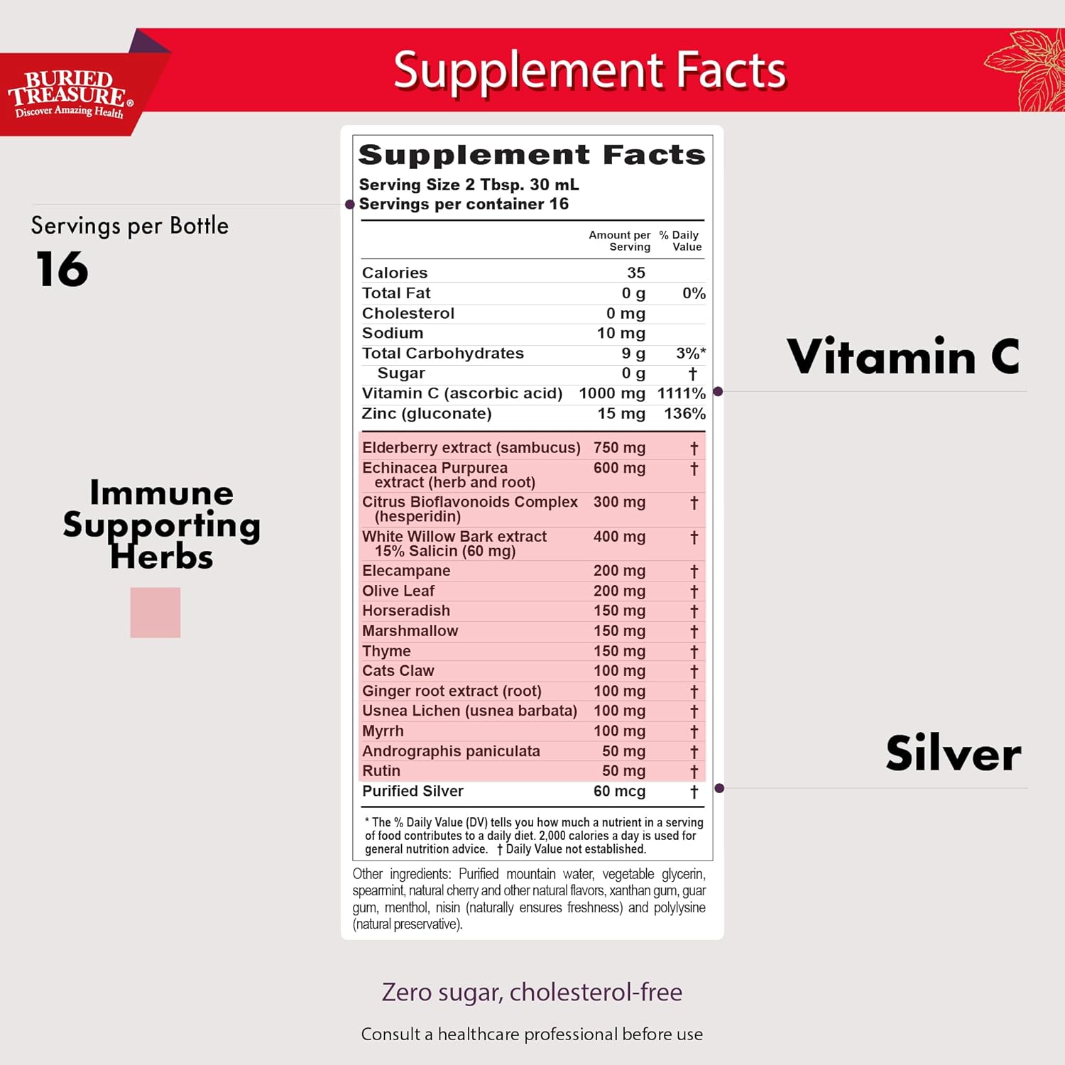 About this item Sambucus Black Elderberry: Enhanced with sambucus black elderberry, Buried Treasure ACF Extra Strength offers immune defense support, combining elderberry & vitamins with a potent blend of botanicals Immune Boosters: Our formula features immune boosters including quercetin and vitamin c with zinc, providing comprehensive immune support supplement for both adult and kids immune health Immune Support: Vitamin C w/ Citrus Bioflavonoids, Echinacea. Elderberry extract, Goldenseal, Myrrh, and more. All these ingredients combined ensure a natural & effective way to boost immunity Adults & Kids: Buried Treasure SACF is safe for adults and kids 12 and up and may help in maintaining a strong immune system. Vegetarian safe, No sugar, No gluten, No wheat, Non-Dairy Buried Treasure SACF Immune Support liquid is designed for immunity, not taste. Fair warning, you will want some juice nearby...SACF taste flavor is not-so-great due to all the herbs and vitamins › See more product details,Sambucus Black Elderberry: Enhanced with sambucus black elderberry, Buried Treasure ACF Extra Strength offers immune defense support, combining elderberry & vitamins with a potent blend of botanicals,Immune Boosters: Our formula features immune boosters including quercetin and vitamin c with zinc, providing comprehensive immune support supplement for both adult and kids immune health,Immune Support: Vitamin C w/ Citrus Bioflavonoids, Echinacea. Elderberry extract, Goldenseal, Myrrh, and more. All these ingredients combined ensure a natural & effective way to boost immunity,Adults & Kids: Buried Treasure SACF is safe for adults and kids 12 and up and may help in maintaining a strong immune system. Vegetarian safe, No sugar, No gluten, No wheat, Non-Dairy,Buried Treasure SACF Immune Support liquid is designed for immunity, not taste. Fair warning, you will want some juice nearby...SACF taste flavor is not-so-great due to all the herbs and vitamins