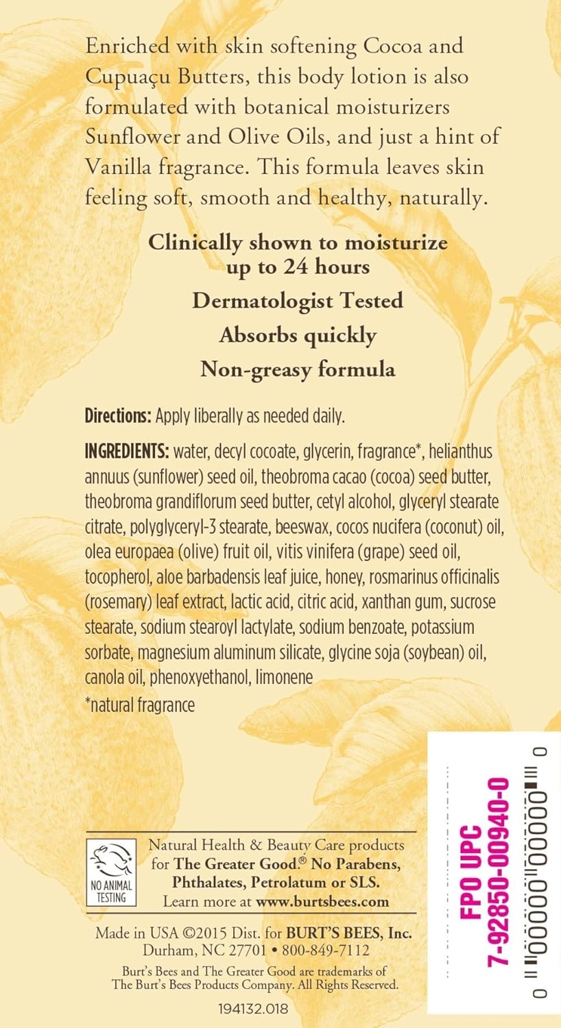 Get All-Day Intense Moisturization From Burts Bees Body Lotion For Dry Skin. This Rich, Non-Greasy Lotion Is Formulated With Cocoa And Cupuau Butter To Nourish The Skin And Leave It Feeling Soft, Smooth And Fully Hydrated. Its Also Formulated With An Enhanced Blend Of Natural Ingredients To Keep The Skin Moisturized And Healthy-Looking. Burts Bees Body Lotion For Dry Skin Is 98.9% Natural Origin And Dermatologist Testedclinically Shown To Moisturize Dry Skin For Up To 24 Hours. Put The Power Of Nature To Work For You With Burt'S Bees