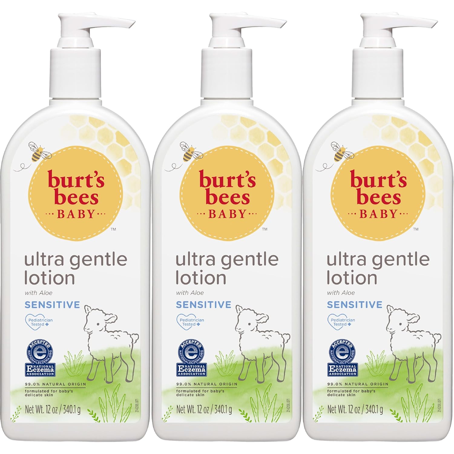 About this item ULTRA GENTLE FORMULA: Burt's Bees Baby ultra lightweight, ultra gentle lotion nourishes and moisturizes baby's sensitive skin, leaving your baby kissably soft WITH SOOTHING ALOE: This 99.0% natural origin lotion is specially formulated with natural ingredients including shea butter, jojoba and aloe to moisturize sensitive skin SENSITIVE BABY CARE: This baby lotion for sensitive skin is lightweight, quick-absorbing and formulated without parabens, phthalates, SLS, petrolatum or synthetic fragrances PEDIATRICIAN TESTED: Accepted by the National Eczema Association and Pediatrician tested, this baby lotion is safe on sensitive skin and eczema prone skin BABY ESSENTIAL: Moisturizing lotion in a pump bottle for easy dispensing is a baby essential so that you can be ready to nourish and soothe baby sensitive skin with the ease of a pump › See more product details,ULTRA GENTLE FORMULA: Burt's Bees Baby ultra lightweight, ultra gentle lotion nourishes and moisturizes baby's sensitive skin, leaving your baby kissably soft,WITH SOOTHING ALOE: This 99.0% natural origin lotion is specially formulated with natural ingredients including shea butter, jojoba and aloe to moisturize sensitive skin,SENSITIVE BABY CARE: This baby lotion for sensitive skin is lightweight, quick-absorbing and formulated without parabens, phthalates, SLS, petrolatum or synthetic fragrances,PEDIATRICIAN TESTED: Accepted by the National Eczema Association and Pediatrician tested, this baby lotion is safe on sensitive skin and eczema prone skin,BABY ESSENTIAL: Moisturizing lotion in a pump bottle for easy dispensing is a baby essential so that you can be ready to nourish and soothe baby sensitive skin with the ease of a pump