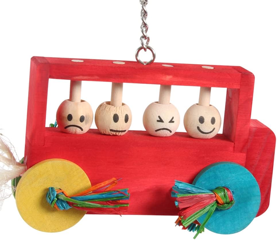 Bringing a bus load of fun your Parrotâ€s way. This Bus of Emotions Parrot Toy is super fun, with wood bead passengers and the wheels on the bus your clever Parrot can move as well as try to remove. The bus itself is made from wood, adding to your beaky buddyâ€s chewing pleasure. Having materials your feathered friend can chew on is important, as it helps them to keep their beak healthy and trim. Colourful maize leaf rope holds the wheels in place, which your Parrot can work at preening on and unravelling. Thereâ€s even some sisal rope for more fun. Use the metal pear link provided to quickly and securely fasten this Bus of Emotions to your birdâ€s cage or play gym stand. Dimensions Length 19cm (7.5") Width 14cm (5.5") Depth 5cm (2â€) Materials Wood, Sisal, Maize Leaf, Metal - Caiques - Large Conures - Meyer's and Senegal Parrots - Quakers also known as the Monk Parakeet - Small Conures Please remember this information is for size guidance only - you know your bird best!
