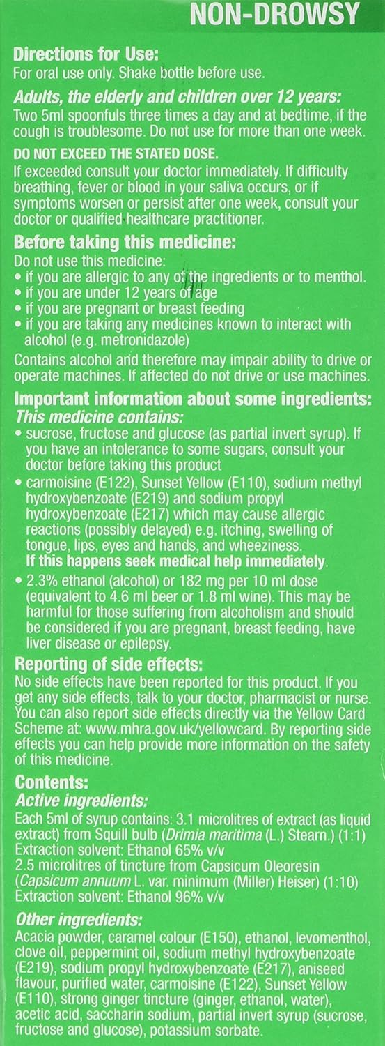 About this item For the relief of any type of cough, cold or sore throat Soothing and effective Non-drowsy Gives soothing and effective relief Contains natural active ingredients like Squill and Capsicum tincture Used for the relief of coughs, colds, sore throats, hoarseness › See more product details,For the relief of any type of cough, cold or sore throat,Soothing and effective,Non-drowsy,Gives soothing and effective relief,Contains natural active ingredients like Squill and Capsicum tincture,Used for the relief of coughs, colds, sore throats, hoarseness