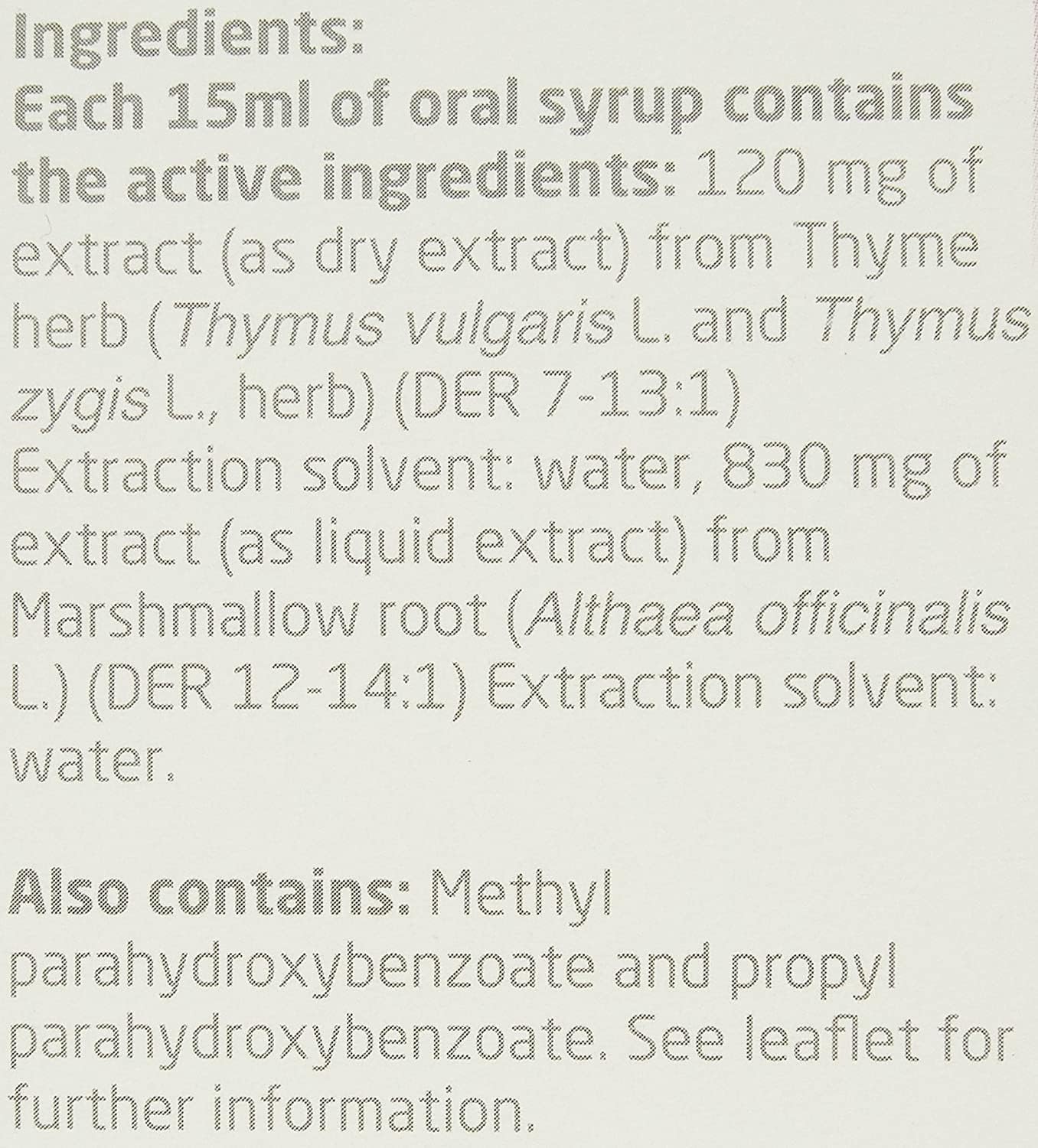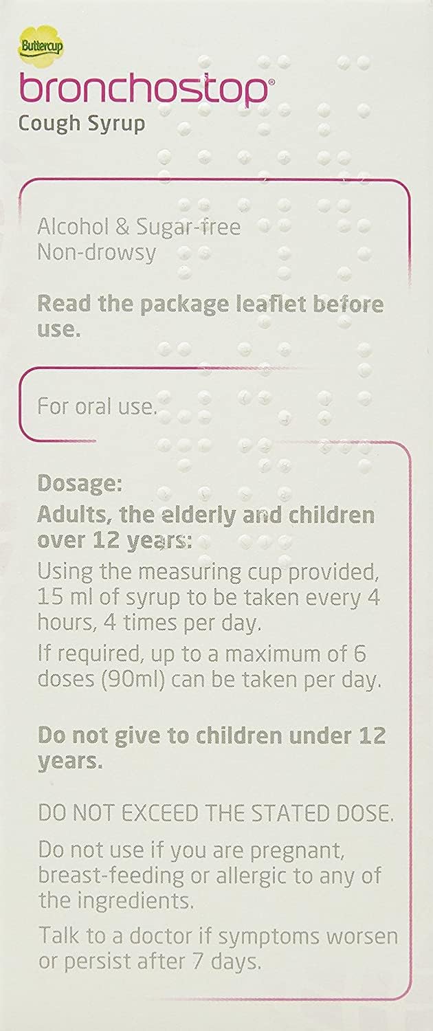 Product Description Bronchostop Cough syrup contains a combination of ingredients not commonly found in other cough products used to relieve any cough: dry, tickly, chesty, mucus or catarrh. Bronchostop is available in traditional cough syrup for at home, and in convenient, on-the-go pastilles. Bronchostop is a traditional herbal medicine used to relieve any cough, based on traditional use only. Bronchostop is traditionally used to relieve any type of cough. If you don’t really know what type of cough you have, or if your cough changes from one to another, Bronchostop takes the hassle out of choosing a solution. Ingredients Each 15 ml of Oral Syrup contains the active ingredients: 120 mg of Extract (as Dry Extract) from Thyme Herb (Thymus Vulgaris L. and Thymus Zygis L., Herb) (DER 7-13:1). Extraction Solvent: Water, 830 mg of Extract (as Liquid Extract) from Marshmallow Root (Althaea Officinalis L.) (DER 12-14:1). Extraction Solvent: Water, Also contains: Methyl Parahydroxybenzoate and Propyl Parahydroxybenzoate, See leaflet for further information P.when('A').execute(function(A) { A.on('a:expander:toggle_description:toggle:collapse', function(data) { window.scroll(0, data.expander.$expander[0].offsetTop-100); }); }); Safety Warning Do not give to children under 12 years. Do not exceed the stated dose do not use if you are pregnant, breast-feeding or allergic to any of the ingredients. Talk to a doctor if symptoms worsen or persist after 7 days. Keep out of sight and reach of children. Manufacturer Contact Information THR Holder: Kwizda Pharma GmbH, Effingergasse 21, A-1160, Vienna, Austria. See more,Traditionally used to relieve any cough,Non-drowsy formula,Alcohol-free,Sugar-free syrup