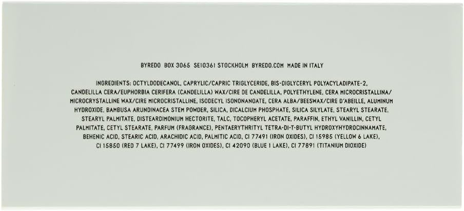 Product Description The unforgettable touch of Lipstick by Byredo. Discover radiant colour Worship Her 119 Lipstick with an ultra-gliding formulation. Give you a luminous finish that melts into the lips. Subtle and weightless achieve beautiful colour with a single stroke. You can increase the intensity by building layers for long-lasting wear that does not bleed. Ingredients INGREDIENTS: OCTYLDODECANOL, CAPRYLIC/CAPRIC TRIGLYCERIDE, BIS-DIGLYCERYL POLYACYLADIPATE-2, CANDELILLA CERA/EUPHORBIA CERIFERA (CANDELILLA) WAX/CIRE DE CANDELILLA, POLYETHYLENE, CERA MICROCRISTALLINA/ MICROCRYSTALLINE WAX/CIRE MICROCRISTALLINE, ISODECYL ISONONANOATE, CERA ALBA/BEESWAX/CIRE D'ABEILLE, ALUMINUM HYDROXIDE, BAMBUSA ARUNDINACEA STEM POWDER, SILICA, DICALCIUM PHOSPHATE, SILICA SILYLATE, STEARYL STEARATE, STEARYL PALMITATE, DISTEARDIMONIUM HECTORITE, TALC, TOCOPHERYL ACETATE, PARAFFIN, ETHYL VANILLIN, CETYL PALMITATE, CETYL STEARATE, PARFUM (FRAGRANCE), PENTAERYTHRITYL TETRA-DI-T-BUTYL HYDROXYHYDROCINNAMATE, BEHENIC ACID, STEARIC ACID, ARACHIDIC ACID, PALMITIC ACID, CI 77491 (IRON OXIDES), CI 15985 (YELLOW 6 LAKE), CI 15850 (RED 7 LAKE), CI 77499 (IRON OXIDES), CI 42090 (BLUE 1 LAKE), CI 77891 (TITANIUM DIOXIDE) P.when('A').execute(function(A) { A.on('a:expander:toggle_description:toggle:collapse', function(data) { window.scroll(0, data.expander.$expander[0].offsetTop-100); }); }); Safety Warning For external use only See more,Discover radiant colour with an ultra-gliding formulatio