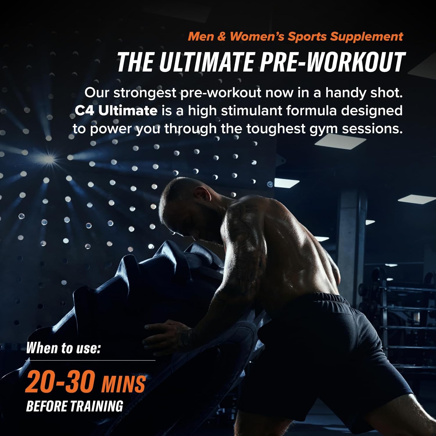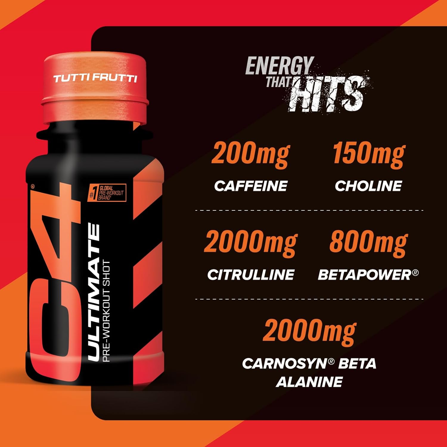 C4 Ultimate Pre-Workout Shot | Tutti Frutti Flavour Energy Shots, 12 X 60Ml Bottles | Sugar Free Pre-Workout Shot With 200Mg Caffeine, 2000Mg L-Citrulline, 2000Mg Beta Alanine, 800Mg Betaine