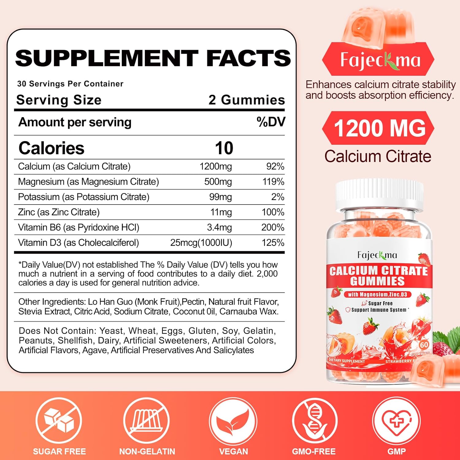 Natural Fruit Flavor & Vegan-Friendly:These calcium supplement gummies come in a natural strawberry flavor. Sugar-free, gelatin-free, non-GMO, gluten-free, soy-free, wheat & yeast-free, 100% vegan, artificial color & flavoring-free. 3rd-Party Tested