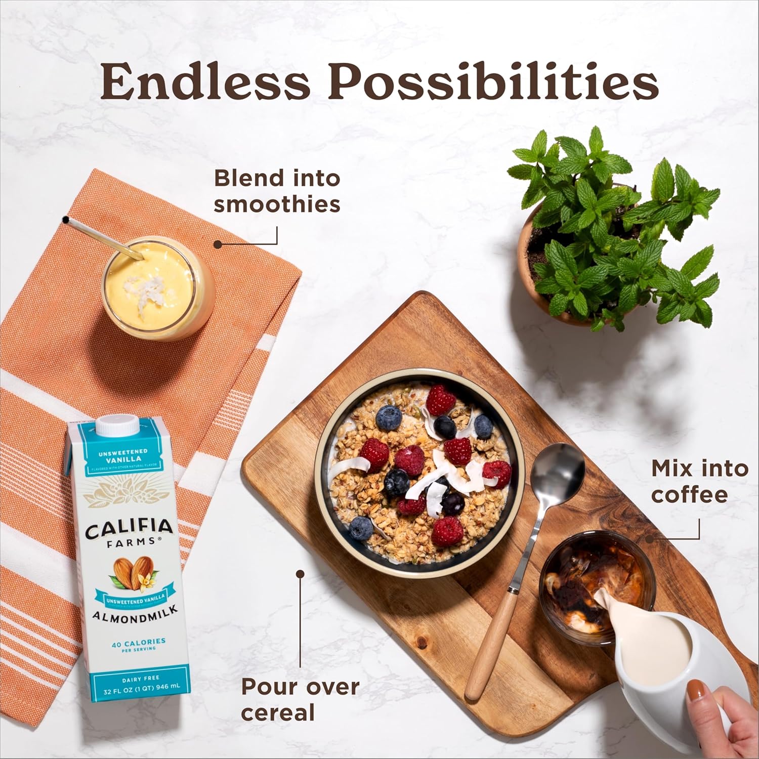 Califia Farms - Unsweetened Vanilla Almond Milk, 32 Oz (Pack Of 6), Dairy Free, Vegan, Plant Based, Keto, Shelf Stable, Vegan, Gluten Free, Non Gmo, Sugar Free, High Calcium, Smoothie