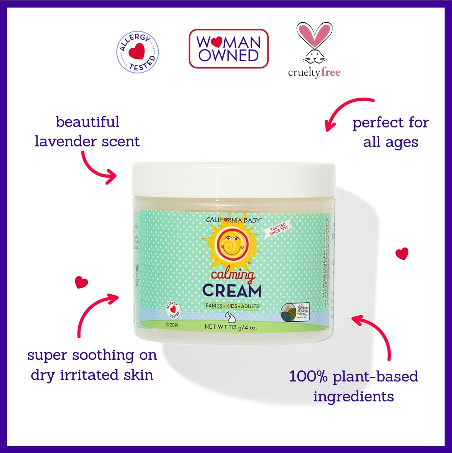 About this item 100% PLANT-BASED INGREDIENTS: Our Calming Cream is made with purified water and contains organic ingredients. No harsh chemicals. Can be used on the face and body. SOOTHES DRY, IRRITATED SKIN: Made for ALL AGES - including babies, kids, and adults with sensitive skin. Our calming cream is non-greasy and absorbs quickly. BEAUTIFUL LAVENDER SCENT: No synthetic fragrances - California Baby Calming Cream is scented with a light, relaxing blend of French lavender and clary sage essential oils STRICTLY ALLERGY TESTED: Our Calming Cream is free of common allergens like gluten, soy, sesame, oat, dairy, peanuts, and tree nuts (except coconut). No risk of cross-contamination with those allergens. TRUSTED SINCE 1995: California Baby was developed by a mother over 27 years ago. All products are blended & manufactured in California Baby’s own FDA Registered manufacturing facility in Los Angeles. California Baby is proudly family owned & operated. › See more product details,100% PLANT-BASED INGREDIENTS: Our Calming Cream is made with purified water and contains organic ingredients. No harsh chemicals. Can be used on the face and body,SOOTHES DRY, IRRITATED SKIN: Made for ALL AGES - including babies, kids, and adults with sensitive skin. Our calming cream is non-greasy and absorbs quickly,BEAUTIFUL LAVENDER SCENT: No synthetic fragrances - California Baby Calming Cream is scented with a light, relaxing blend of French lavender and clary sage essential oils,STRICTLY ALLERGY TESTED: Our Calming Cream is free of common allergens like gluten, soy, sesame, oat, dairy, peanuts, and tree nuts (except coconut). No risk of cross-contamination with those allergens,TRUSTED SINCE 1995: California Baby was developed by a mother over 27 years ago. All products are blended & manufactured in California Baby’s own FDA Registered manufacturing facility in Los Angeles. California Baby is proudly family owned & operated