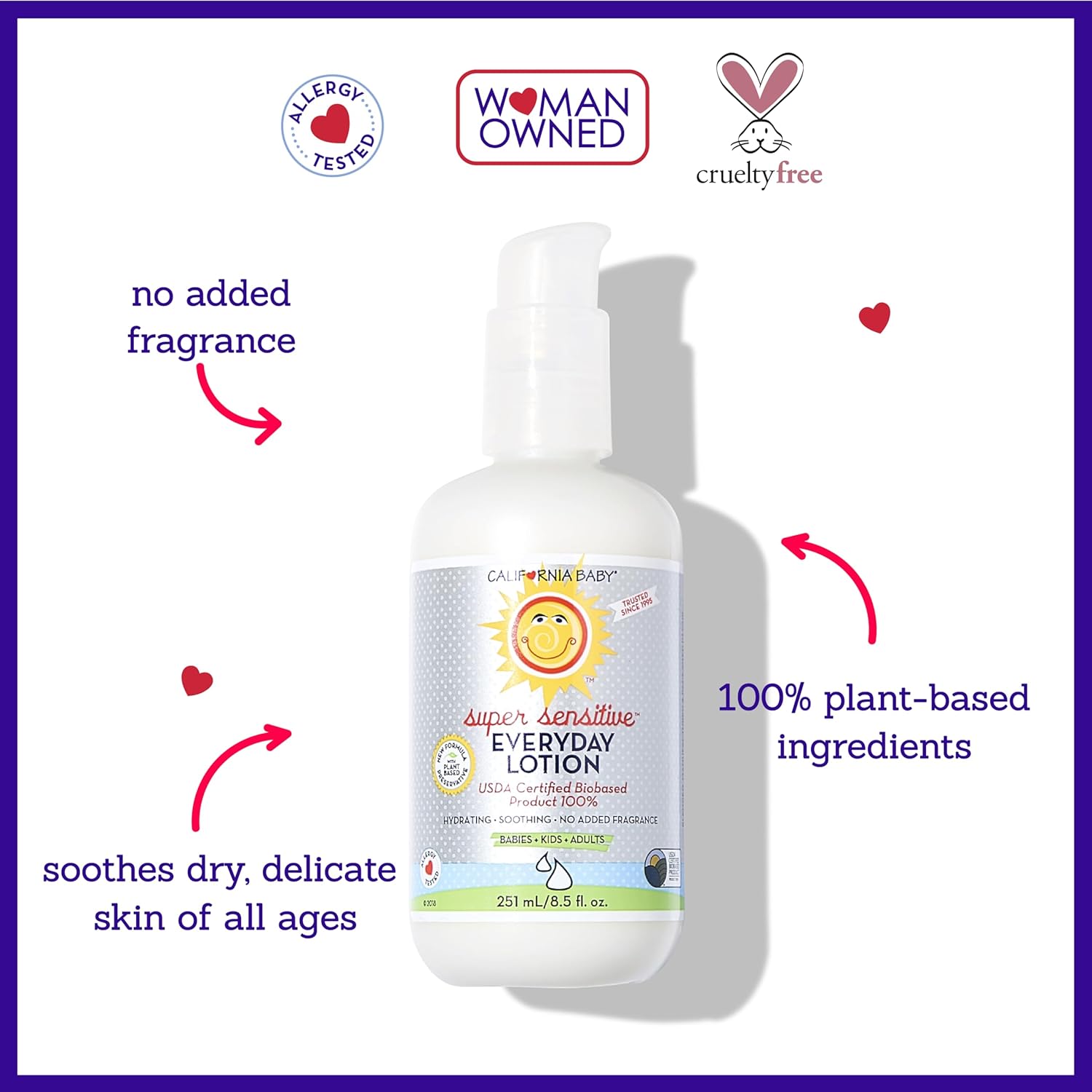 About this item 100% PLANT-BASED, SENSITIVE SKIN LOTION: This body + face moisturizer for dry skin is USDA Certified 100% Bio-Based, meaning all ingredients are 100% plant-based. Voted one of the best baby lotion sensitive skin. Free of petroleum ingredients. SOOTHING MOISTURIZER FOR DRY SKIN: This vegan body + face cream can be used by all ages – including adults! Very versatile – use as a cream for dry skin, hand cream, facial moisturizer, or a hand lotion. Organic calendula + aloe vera soothe dry, irritated skin. FRAGRANCE FREE LOTION: This unscented lotion has no added fragrance and is recommended as a body lotion for sensitive skin for adults and a baby lotion sensitive skin. Our unscented body lotion is also a perfect soothing, unscented hand cream for women. HYPOALLERGENIC LOTION: Our Super Sensitive Lotion is allergy tested + free of gluten, soy, sesame, oat, dairy, peanuts, and tree nuts (except coconut). An ideal lotion for kids with allergies - this gluten free lotion has no risk of cross-contamination. CALIFORNIA BABY CREAMS VS. LOTIONS: Our Super Sensitive Lotion is perfect for light, everyday face & body moisturizing. For extra-dry areas, try our Unscented Calendula Cream. It’s thicker and more concentrated. › See more product details,100% PLANT-BASED, SENSITIVE SKIN LOTION: This body + face moisturizer for dry skin is USDA Certified 100% Bio-Based, meaning all ingredients are 100% plant-based. Voted one of the best baby lotion sensitive skin. Free of petroleum ingredients,SOOTHING MOISTURIZER FOR DRY SKIN: This vegan body + face cream can be used by all ages – including adults! Very versatile – use as a cream for dry skin, hand cream, facial moisturizer, or a hand lotion. Organic calendula + aloe vera soothe dry, irritated skin,FRAGRANCE FREE LOTION: This unscented lotion has no added fragrance and is recommended as a body lotion for sensitive skin for adults and a baby lotion sensitive skin. Our unscented body lotion is also a perfect soothing, unscented hand cream for women,HYPOALLERGENIC LOTION: Our Super Sensitive Lotion is allergy tested + free of gluten, soy, sesame, oat, dairy, peanuts, and tree nuts (except coconut). An ideal lotion for kids with allergies - this gluten free lotion has no risk of cross-contamination,CALIFORNIA BABY CREAMS VS. LOTIONS: Our Super Sensitive Lotion is perfect for light, everyday face & body moisturizing. For extra-dry areas, try our Unscented Calendula Cream. It’s thicker and more concentrated
