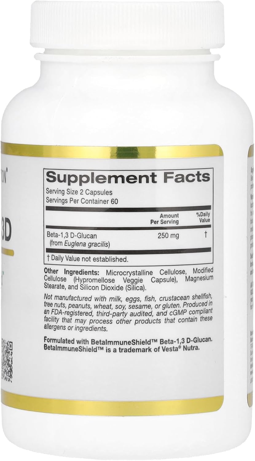 California Gold Nutrition Beta Glucan 1-3D with Beta-ImmuneShield Beta-Glucan from Algae (Euglena gracilis)Highly Purified Beta Glucan 1,3D Extracted from Cell WallSupports Healthy Immune Function*Formulated to Contain: No Gluten, No GMOs, No SoyProduced in a 3rd Party Audited cGMP Registered (Certified) Facility100% Gold GuaranteeBeta-glucan is a type of soluble fiber polysaccharide that can be found in cereal grains, yeast, some medicinal mushrooms, as well as some types of algae. The bioactive compound Beta Glucan 1,3D is derived from the cell wall of Euglena gracilis, a type of algae. Scientific studies have shown that Beta Glucan 1,3D supports overall immune health by helping to maintain several of the body's immune functions.*California Gold Nutrition Beta Glucan 1-3D contains Beta-ImmuneShield, a purified form of Beta Glucan 1,3D derived from the cell walls of the algae Euglena gracilis.Research suggests that the Beta Glucan in Beta-ImmuneShield:Supports Overall Immune System Function*Supports the Bodies Defense Mechanisms