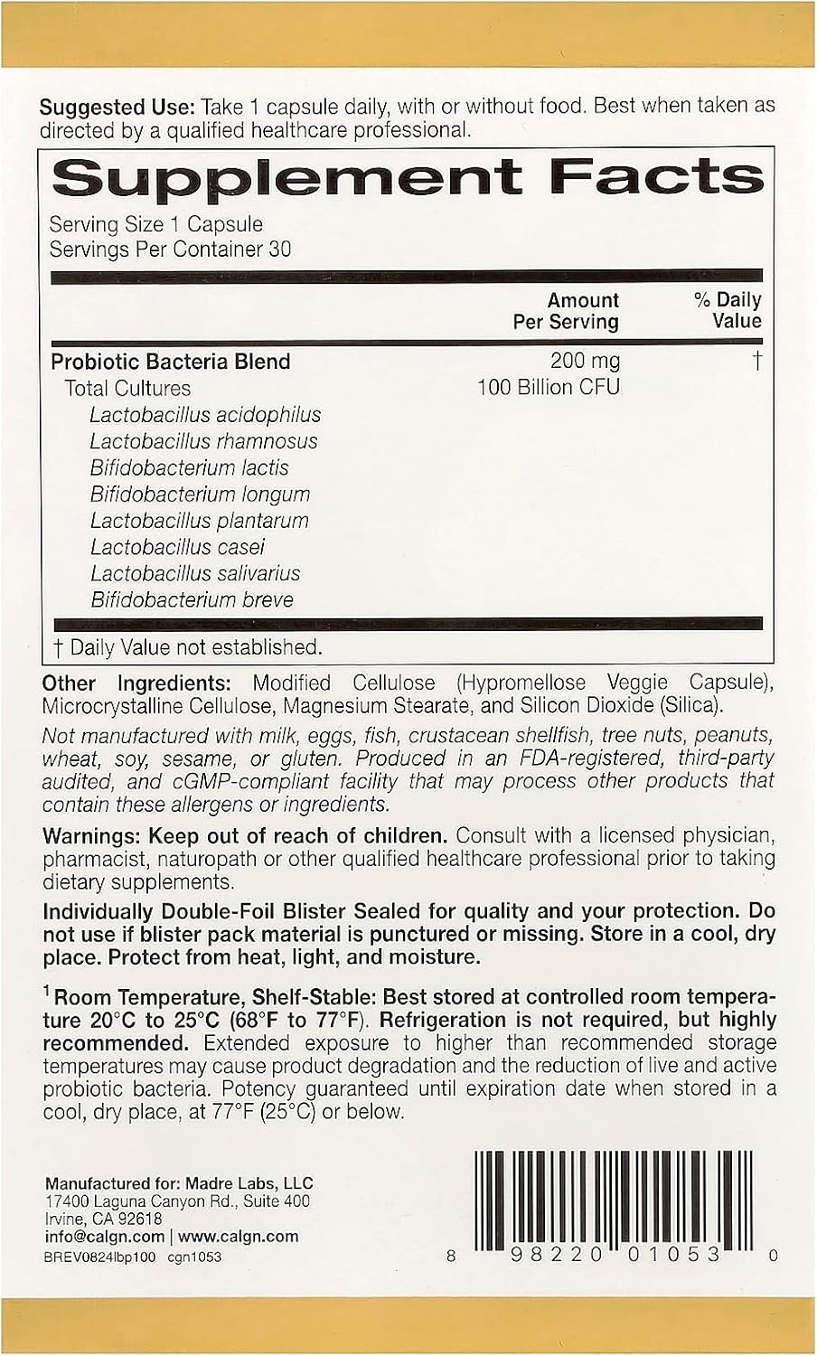 California Gold Nutrition Lactobif Probiotics, 100 Bllion Cfu, 8 Active & Clinically Researched Probiotic Strains, Sugar-Free, Vegetarian, Individually Double-Foil Blister Sealed, 30 Veggie Capsules