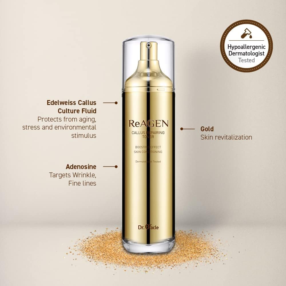 About this item VISIBLY DIMINSH APPEARANCE OF WRINKLES: Clinical-grade, high strength formula infused with potent anti-wrinkle ingredients such as Adenosine and Gold works tirelessly to smooth away fine lines while delivering plumping effect that restores your skin's natural volume. PREMIUM SPA CARE: Elevate your skincare routine with our luxurious ReAGEN line, offering a premium spa-level experience to unveil a more youthful and revitalized complexion. Use generous amount to pat and massage face and neck for optimal results. ANTI-AGING POWERHOUSE: Conatins Edelweiss Callus Culture Fluid rich in phytochemicals, it combats various signs of aging and forms a protective barrier, shielding your skin from harmful environmental factors such as UV rays and pollution. Sun damage is one of major factors contributing to early signs of aging. SUITABLE FOR ALL SKIN TYPES: Suitable and recommended for all skin types looking for a lightweight, hydrating toner to improve saggy and dry skin. Use multiple layers if you have extremely dry to dry skin type. RECOMMENDED BY DERMATOLOGISTS: Products by Dr.Oracle Cosmetics are developed and recommended by dermatologists with 20+ years of experience, specifically for sensitive skin, dry skin, acne-prone and more. See more product details,VISIBLY DIMINSH APPEARANCE OF WRINKLES: Clinical-grade, high strength formula infused with potent anti-wrinkle ingredients such as Adenosine and Gold works tirelessly to smooth away fine lines while delivering plumping effect that restores your skin's natural volume,PREMIUM SPA CARE: Elevate your skincare routine with our luxurious ReAGEN line, offering a premium spa-level experience to unveil a more youthful and revitalized complexion. Use generous amount to pat and massage face and neck for optimal results,ANTI-AGING POWERHOUSE: Conatins Edelweiss Callus Culture Fluid rich in phytochemicals, it combats various signs of aging and forms a protective barrier, shielding your skin from harmful environmental factors such as UV rays and pollution. Sun damage is one of major factors contributing to early signs of aging,SUITABLE FOR ALL SKIN TYPES: Suitable and recommended for all skin types looking for a lightweight, hydrating toner to improve saggy and dry skin. Use multiple layers if you have extremely dry to dry skin type,RECOMMENDED BY DERMATOLOGISTS: Products by Dr.Oracle Cosmetics are developed and recommended by dermatologists with 20+ years of experience, specifically for sensitive skin, dry skin, acne-prone and more
