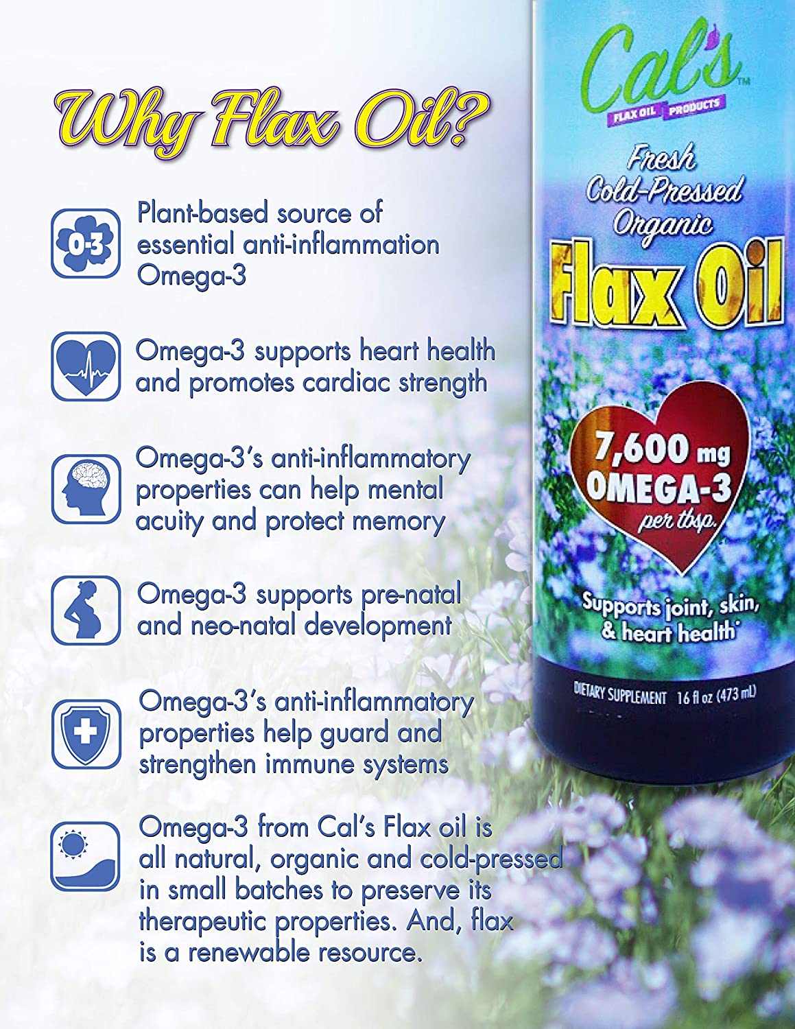 Cal'S Flax Oil - Essential, Organic Omega-3, Pure, 100% Cold-Pressed, Virgin, Unrefined & Organic - Vegetarian Source Of Omega-3 For Skin, Joint, Heart, Brain, & Nerve Health Support