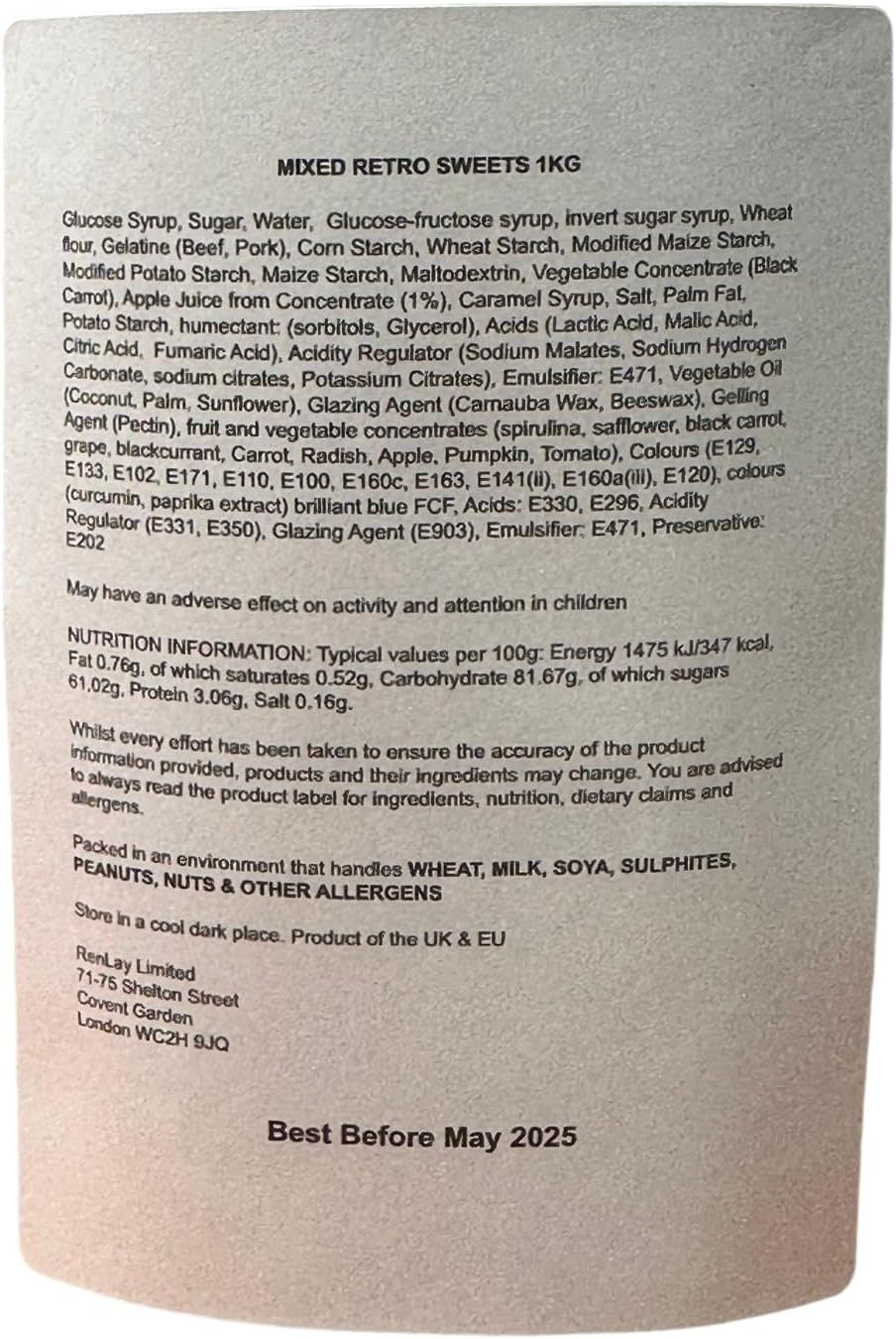 About this item Variety: Pick and Mix pouches contain at least 30 different varieties. Our retro gummy collection contains over 50 different types of jelly sweets. An incredible mix of sour and non-sour jelly sweets packed into every Party sized bag Premium Quality: Savor the flavor,premium quality in every bite. This is Pick and Mix on another level, jelly sweets that will amuse your taste buds Fantastic Jelly Sweets: Huge 1kg bag, 30 different varieties of the best retro sweets! Carefully selected, enjoy the range in one foil fresh resealable pouch Freshest sweets, Guaranteed to stay more fresh than standard plastic pouches Classic Pick n Mix sweets in easy to reseal pouches, this ensures the candy stays fresh and can be enjoyed again and again with the same fresh gummy texture and flavours. The Ideal Gift: We have made our bags vibrant and visually pleasing on your eyes, a jelly sweet combo makes a perfect gift. Christmas, Birthdays, Mothers day, Fathers day and add fun to any family celebration › See more product details,Variety: Pick and Mix pouches contain at least 30 different varieties. Our retro gummy collection contains over 50 different types of jelly sweets. An incredible mix of sour and non-sour jelly sweets packed into every Party sized bag,Premium Quality: Savor the flavor,premium quality in every bite. This is Pick and Mix on another level, jelly sweets that will amuse your taste buds,Fantastic Jelly Sweets: Huge 1kg bag, 30 different varieties of the best retro sweets! Carefully selected, enjoy the range in one foil fresh resealable pouch,Freshest sweets, Guaranteed to stay more fresh than standard plastic pouches,Classic Pick n Mix sweets in easy to reseal pouches, this ensures the candy stays fresh and can be enjoyed again and again with the same fresh gummy texture and flavours,The Ideal Gift: We have made our bags vibrant and visually pleasing on your eyes, a jelly sweet combo makes a perfect gift. Christmas, Birthdays, Mothers day, Fathers day and add fun to any family celebration