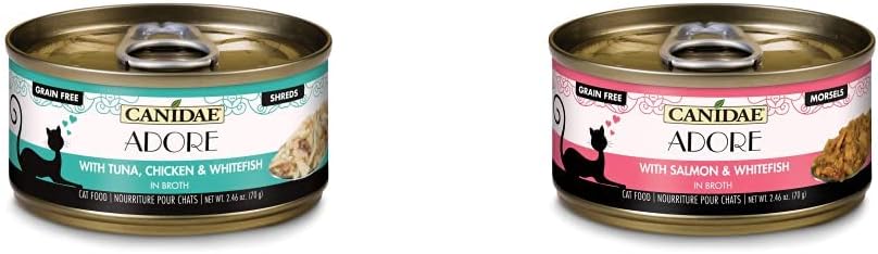 Contains 24- 2.46 Ounce Cans of Canidae Adore Shreds with Tuna, Chicken and Whitefish in Broth Wet Cat Food and 24- 2.46 Ounce Cans of Canidae Adore Morsels with Salmon and Whitefish in Broth Wet Cat Food (48 Cans Total)