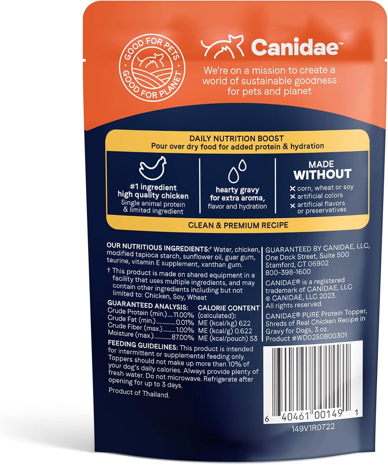 Add A Boost Of Protein, Flavor And Hydration With Canidae'S Pure Protein Toppers. Made With Shreds Of Real Chicken, This Is A Single Animal Protein Source Recipe With Only 2 Key Ingredients. Made Without Corn, Wheat Or Soy, And No Artificial Colors, Flavors Or Preservatives