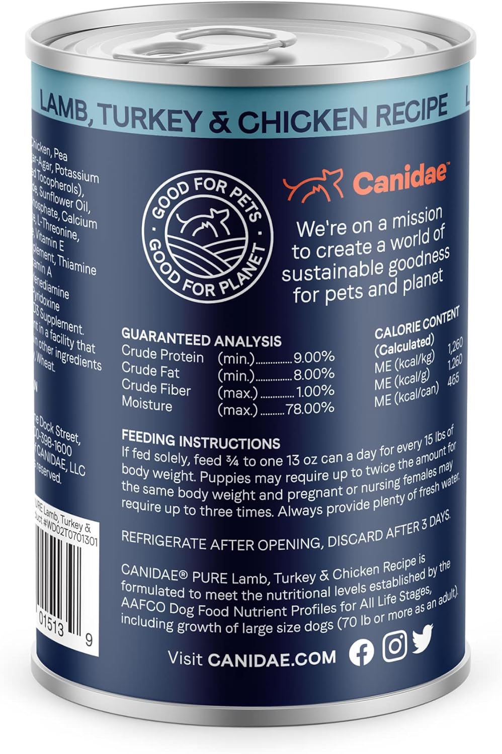 Canidae Pure Lamb, Turkey And Chicken Recipe Wet Dog Food Is Formulated To Meet The Nutritional Levels Established By The Aafco Dog Food Nutrient Profiles For Maintenance. Canidae Pure Grain-Free Limited Ingredient Formulas Offer Your Dog A Well-Rounded Meal That’S Been Crafted With Their Health And Well-Being In Mind. Our Lamb, Turkey And Chicken Recipe Is Made Using A Limited Number Of Wholesome Ingredients That Are Easily Recognizable, With Real Lamb As The First Ingredient, Along With Turkey, Chicken, Peas And Sweet Potatoes. This Grain-Free, Hypoallergenic Wet Dog Food Is Ideal For Pups With A Sensitive Stomach And Offers Nothing But Pure Goodness For Your Best Friend. High Quality, Wholesome Ingredients Like Farm-Grown Veggies And Premium Proteins Rich In Essential Amino Acids And Omega 3 And 6 Fatty Acids Means You'Re Giving Your Pet The Goodness They Deserve With No Corn, Wheat, Soy Or Other Fillers. Canidae Pet Foods Are Nutritionally Dense, Nourishing Your Dog In Every Bite. Canidae Was Founded In 1996 With The Belief That Pet Food Needed To Be Better. Better For Pets And Better For Us All. That Belief Lives On Today In Our Mission To Create A World Of Sustainable Goodness For Pets And Our Planet. We Nourish Pets And Planet In Every Bowl, Through Our Use Of Wholesome, Responsibly Sourced Proteins, And Our Investment In Regenerative Farming, Sustainable Operations, And Eco-Friendly Packaging, Setting A New Standard For The Pet Food Industry. Everything We Do Results In A Better Product. A Bowl Full Of Goodness