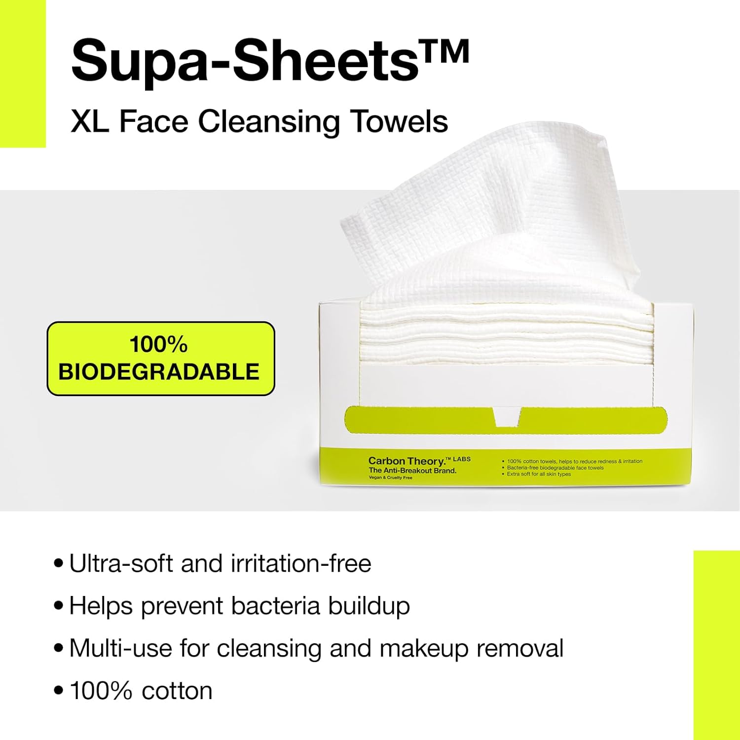 Carbon Theory Supa-Sheets Xl Facial Cleansing Towels - 50 X Biodegradable Face Towels Single-Use - Ultra-Soft 100% Cotton - Makeup Remover Cleansing Wipes