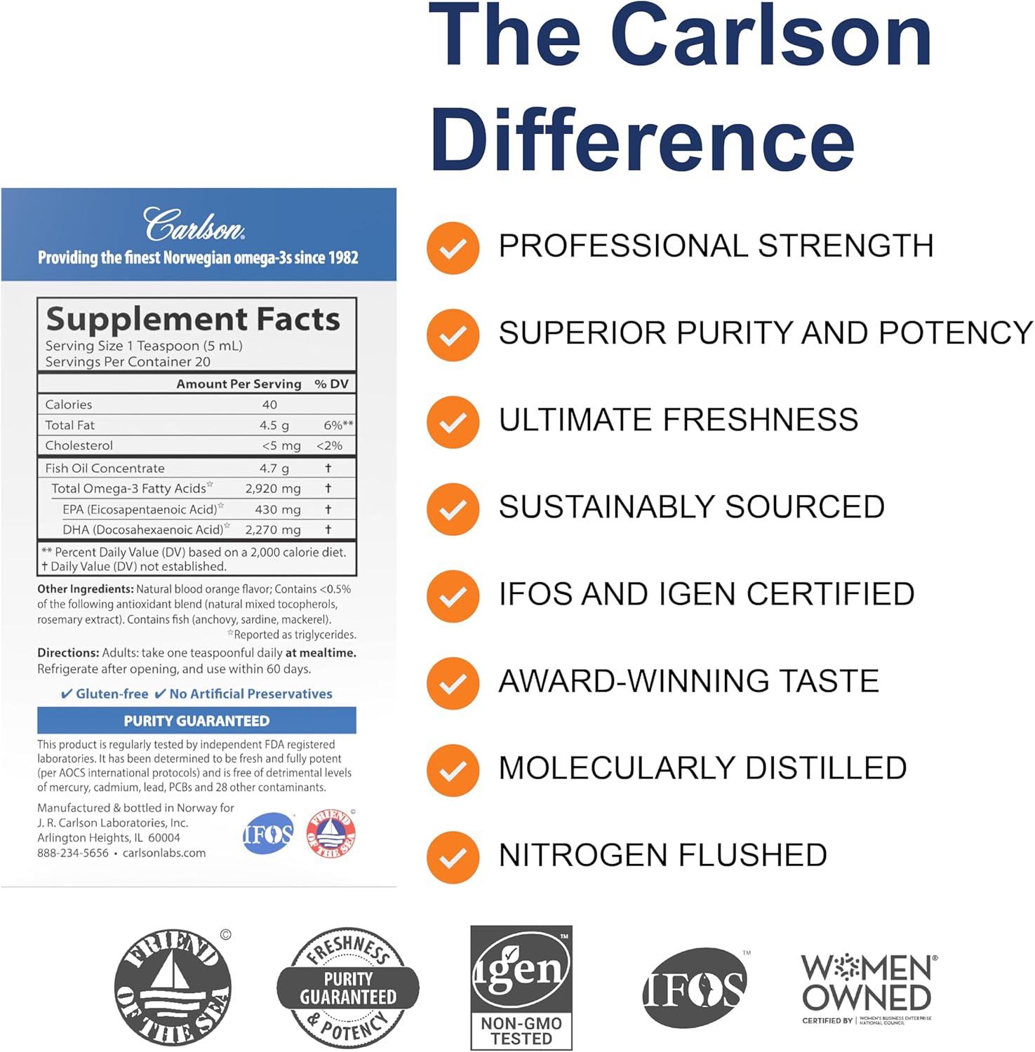 About this item Promotes mood and overall health and wellness 2,270 mg of DHA per teaspoon | Delicious natural orange flavor Wild caught and sustainably sourced | Bottled in Norway IFOS and IGEN non-GMO certified Freshness, potency, and purity guaranteed  See more product details,Promotes mood and overall health and wellness,2,270 mg of DHA per teaspoon | Delicious natural orange flavor,Wild caught and sustainably sourced | Bottled in Norway,IFOS and IGEN non-GMO certified,Freshness, potency, and purity guaranteed