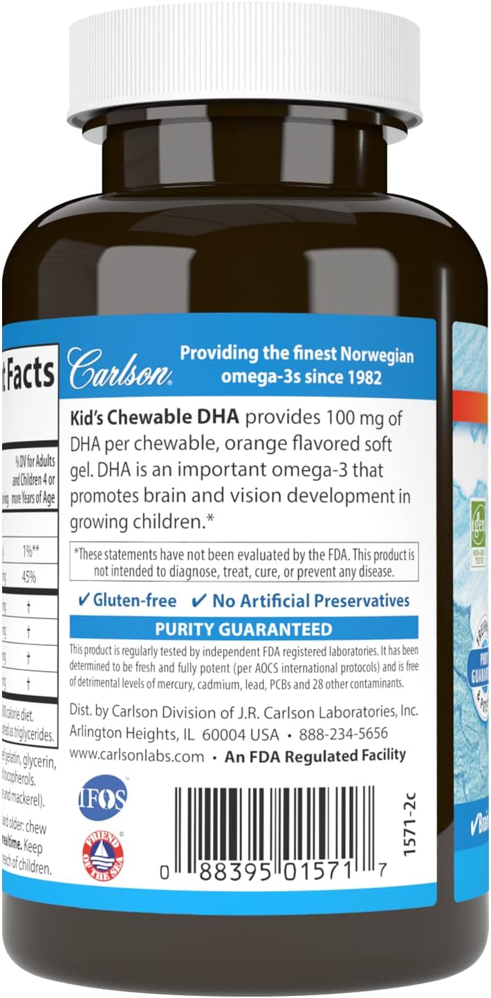 Carlson - Kid'S Chewable Dha, 100 Mg Dha, Brain Health, Vision Function, Growth & Development, Orange, 120 Chewable Softgels