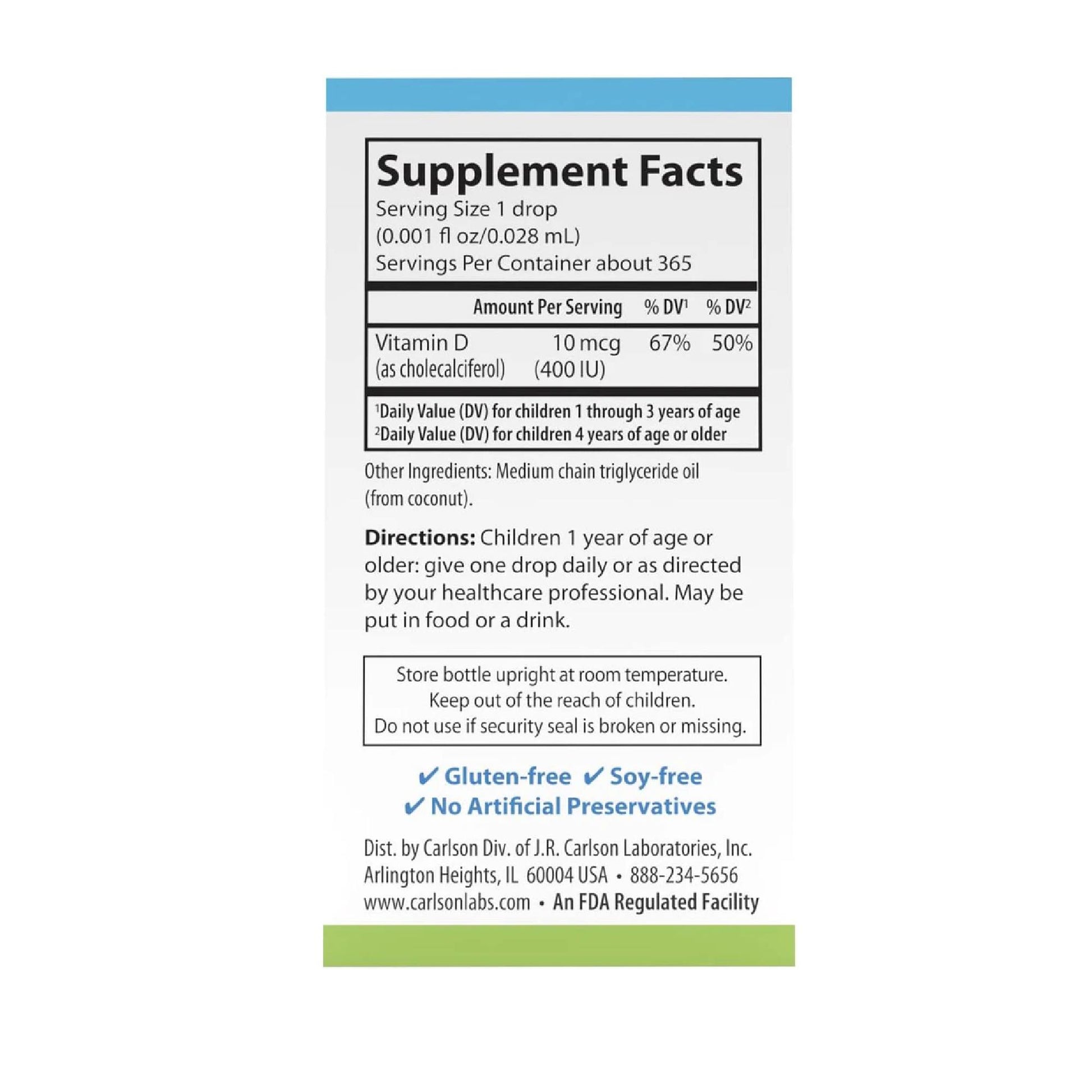 DESCRIPTION : Carlson - Kid's Super Daily D3, Kids Vitamin D Drops, 400 IU (10 mcg) per Drop, Heart & Immune Health, Vegetarian, Liquid Vitamin D Drops, Unflavored, 365 Drops