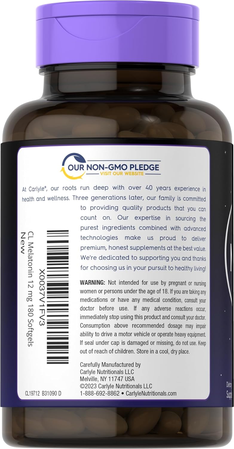 Carlyle Melatonin 12 Mg | 180 Softgel Capsules | Adult Extra Strength Support Supplement | Non-Gmo, Gluten Free