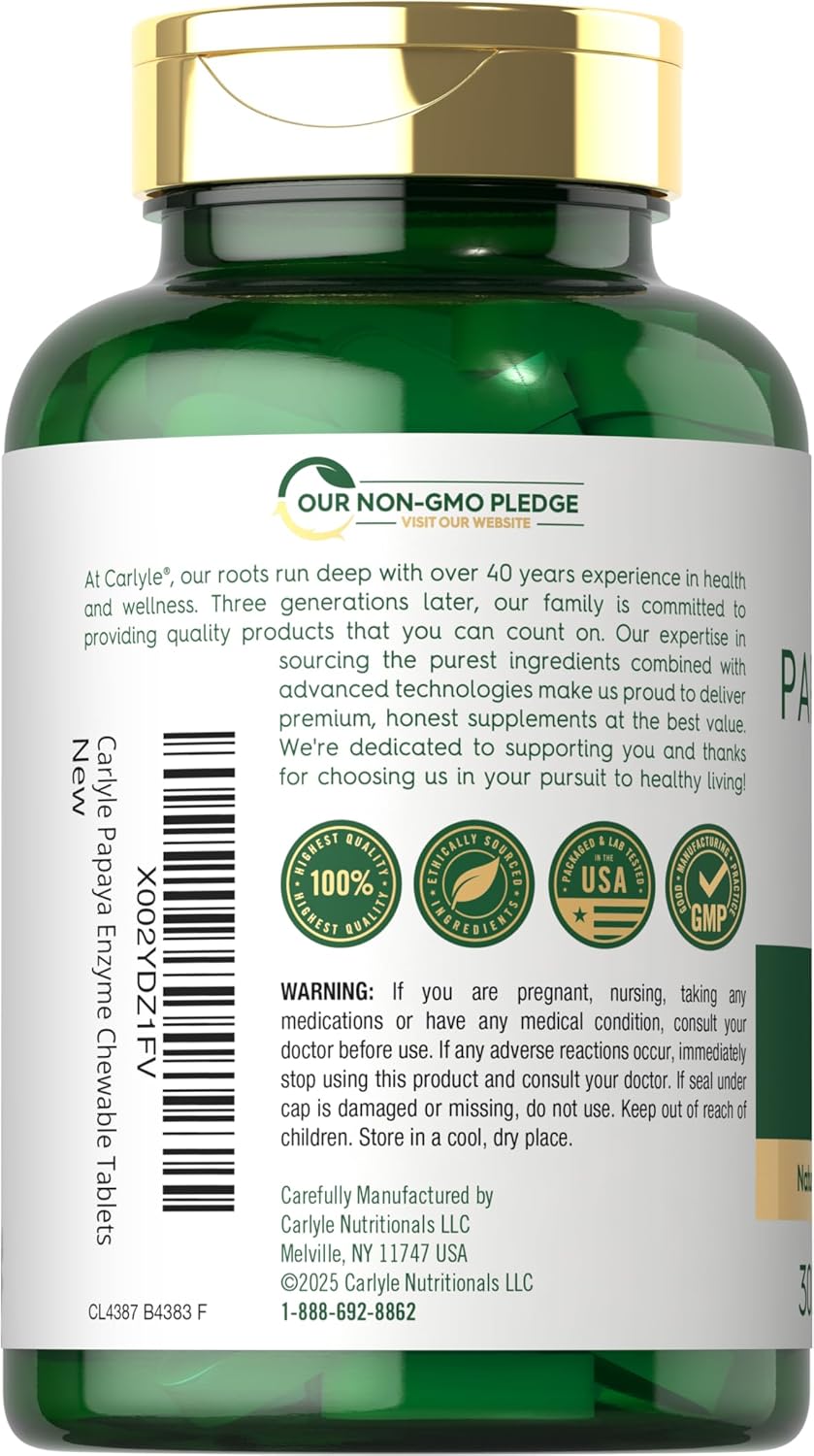 About this item TROPICAL SWEET: Reap the benefits of Papaya fruit with tasty tropical chewable tablets! ENZYME COMPLEX: Features a precise blend of enzymes such as Papain from Papaya Fruit, Protease, and more ROOTED IN WELLNESS: Carlyle provides premium, honest supplements in your pursuit to healthy living CARLYLE MANUFACTURERS: Laboratory Tested, Trusted Ingredients and Superior Quality! NATURALLY FREE OF: Gluten, Wheat, Yeast, Lactose, Soy, Artificial Flavor, Preservatives & Non-GMO See more product details,TROPICAL SWEET: Reap the benefits of Papaya fruit with tasty tropical chewable tablets!,ENZYME COMPLEX: Features a precise blend of enzymes such as Papain from Papaya Fruit, Protease, and more,ROOTED IN WELLNESS: Carlyle provides premium, honest supplements in your pursuit to healthy living,CARLYLE MANUFACTURERS: Laboratory Tested, Trusted Ingredients and Superior Quality!,NATURALLY FREE OF: Gluten, Wheat, Yeast, Lactose, Soy, Artificial Flavor, Preservatives & Non-GMO