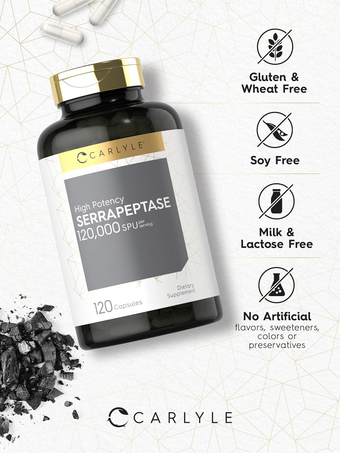 About this item SERRAPEPTASE: Receive a potent source of this proteolytic enzyme derived from silkworm HIGH POTENCY: Features 120,000 SPU per serving, a powerful supply for your daily routine! ROOTED IN WELLNESS: Carlyle provides premium, honest supplements in your pursuit to healthy living CARLYLE MANUFACTURERS: Laboratory Tested, Trusted Ingredients, Superior Quality, 100% Guaranteed! NATURALLY FREE OF: Gluten, Wheat, Yeast, Lactose, Soy, Artificial Flavor, Preservatives & Non-GMO See more product details,SERRAPEPTASE: Receive a potent source of this proteolytic enzyme derived from silkworm,HIGH POTENCY: Features 120,000 SPU per serving, a powerful supply for your daily routine!,ROOTED IN WELLNESS: Carlyle provides premium, honest supplements in your pursuit to healthy living,CARLYLE MANUFACTURERS: Laboratory Tested, Trusted Ingredients, Superior Quality, 100% Guaranteed!,NATURALLY FREE OF: Gluten, Wheat, Yeast, Lactose, Soy, Artificial Flavor, Preservatives & Non-GMO