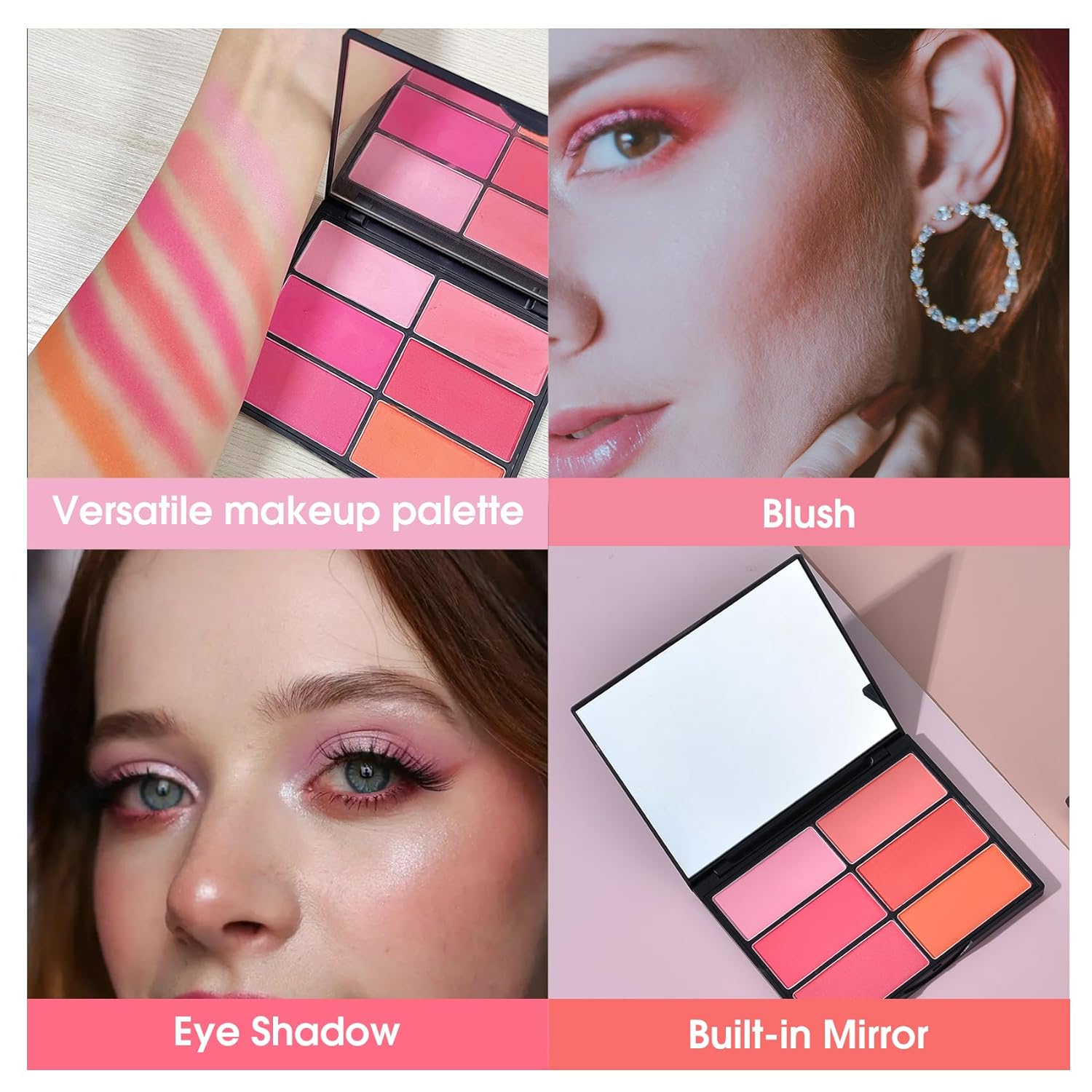 ABOUT THE PRODUCT: 1 > 6 Pigmented Powder Blusher: Indulge in a versatile range of 6 stunning and highly pigmented blush shades, including pink, peach, neutrals, rose and orange. The different options allow you to mix and customize your blush for unique looks 2 > Matte and Shimmer Finishes: Create various looks with 3 matte and 3 shimmer blush options for a customized finish 3 > Built-in Mirror: Conveniently touch up on the go with the built-in mirror for effortless applicationCarmela 6 Colors Powder Blush Palette, Matte and Shimmer Blush for Cheeks, Highly Pigmented Long Lasting Baked Blush Pallet