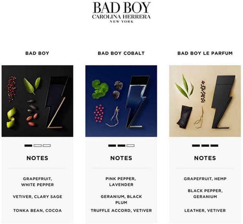 Product Description Carolina Herrera EAU DE Toilette man 100 milliliters. Fragrance: Eau de Toilette weight: 100 milliliters. Eau de Toilette man 100 milliliters. Ingredients ALCOHOL DENAT., PARFUM (FRAGRANCE), AQUA (WATER), COUMARIN, ETHYLHEXYL METHOXYCINNAMATE, LINALOOL LIMONENE, ALPHA-ISOMETHYL IONONE, ETHYLHEXYL SALICYLATE, BUTYL METHOXYDIBENZOYLMETHANE, GERANIOL, CITRAL, CITRONELLOL, METHYL 2-OCTYNOATE, HYDROXYCITRONELLAL, CINNAMAL P.when('A').execute(function(A) { A.on('a:expander:toggle_description:toggle:collapse', function(data) { window.scroll(0, data.expander.$expander[0].offsetTop-100); }); }); Directions stay away from kids See more,Weight: 100 ml,Eau de toilette man 100 ml,Embrace the duality of man embark on an intense journey of the senses the bad boy eau de toilette intrigues with notes of spicy black and white pepper, settling into muskier undertones of bergamot, tonka bean, and cocoa,Radiant, long-lasting scent excite and enthrall your senses with a seductive, masculine scent that emanates all day,Fragrance: eau de toilette,For the bold and enticing side of you formulated to intrigue and attract, this vibrant amber spicy fragrance turns heads, as it emulates a sense of striking strength and mystery