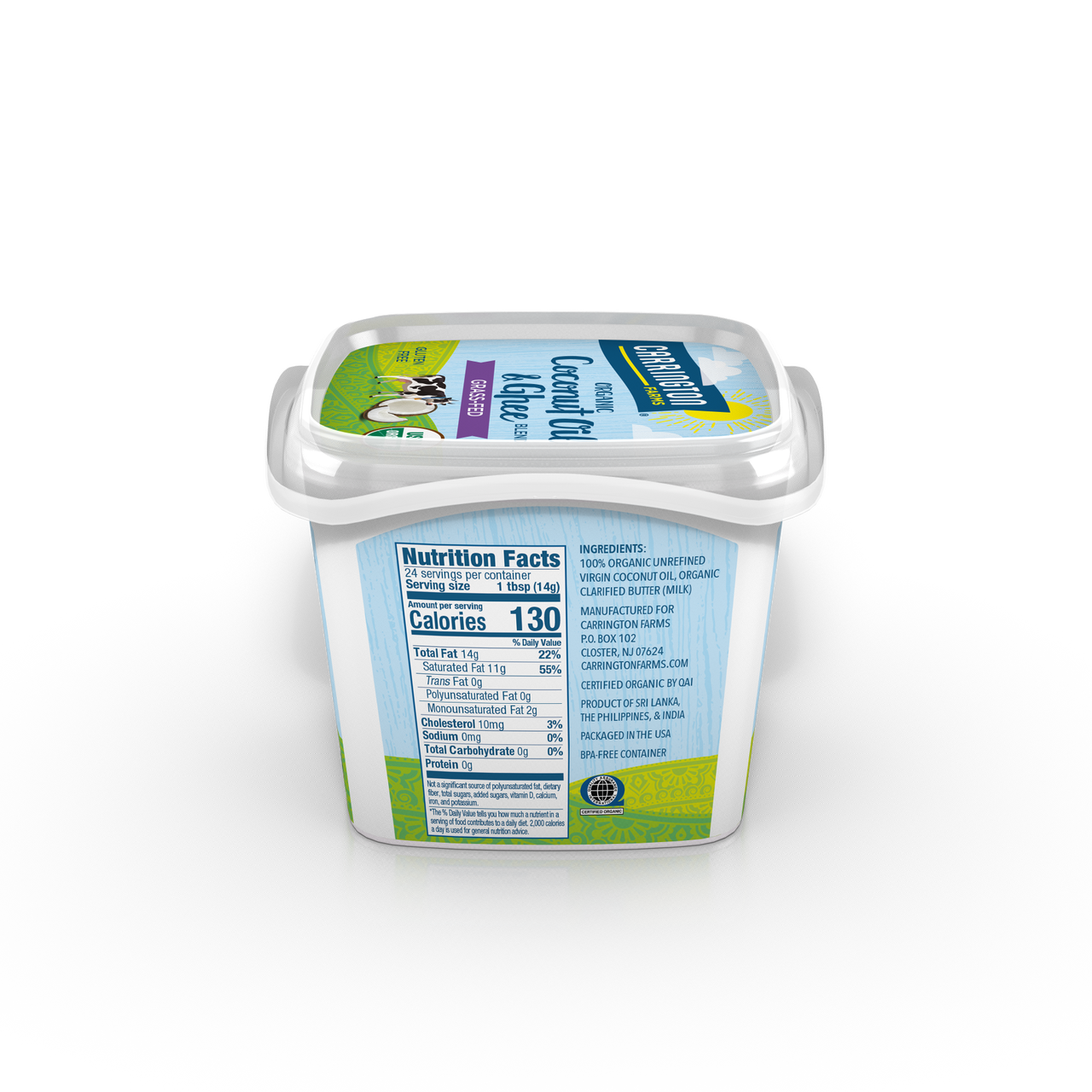 Ghee is an ancient health food that contains significant levels of vitamin A, D & E. Dairy Free, No Casein, Whey or Lactose. Gluten Free. Coconut Oil is high in Medium Chain Triglycerides known to reduce inflammation and increase energy. Our Ghee starts out with butter from organic grass fed cows. It is then melted into a pure butter oil and triple filtered to remove all the milk solids including lactose and casein. HIGH SMOKE POINT- This means our organic, grass fed ghee is perfect for cooking, sautƩing, and baking because it burns at a higher temperature than other cooking oils including regular butter. LONGER SHELF LIFE - Since the milk solids are removed, ghee does not spoil as quickly as regular butter. Carrington Farms Organic Coconut Oil & Ghee Grass-Fed 12 Oz